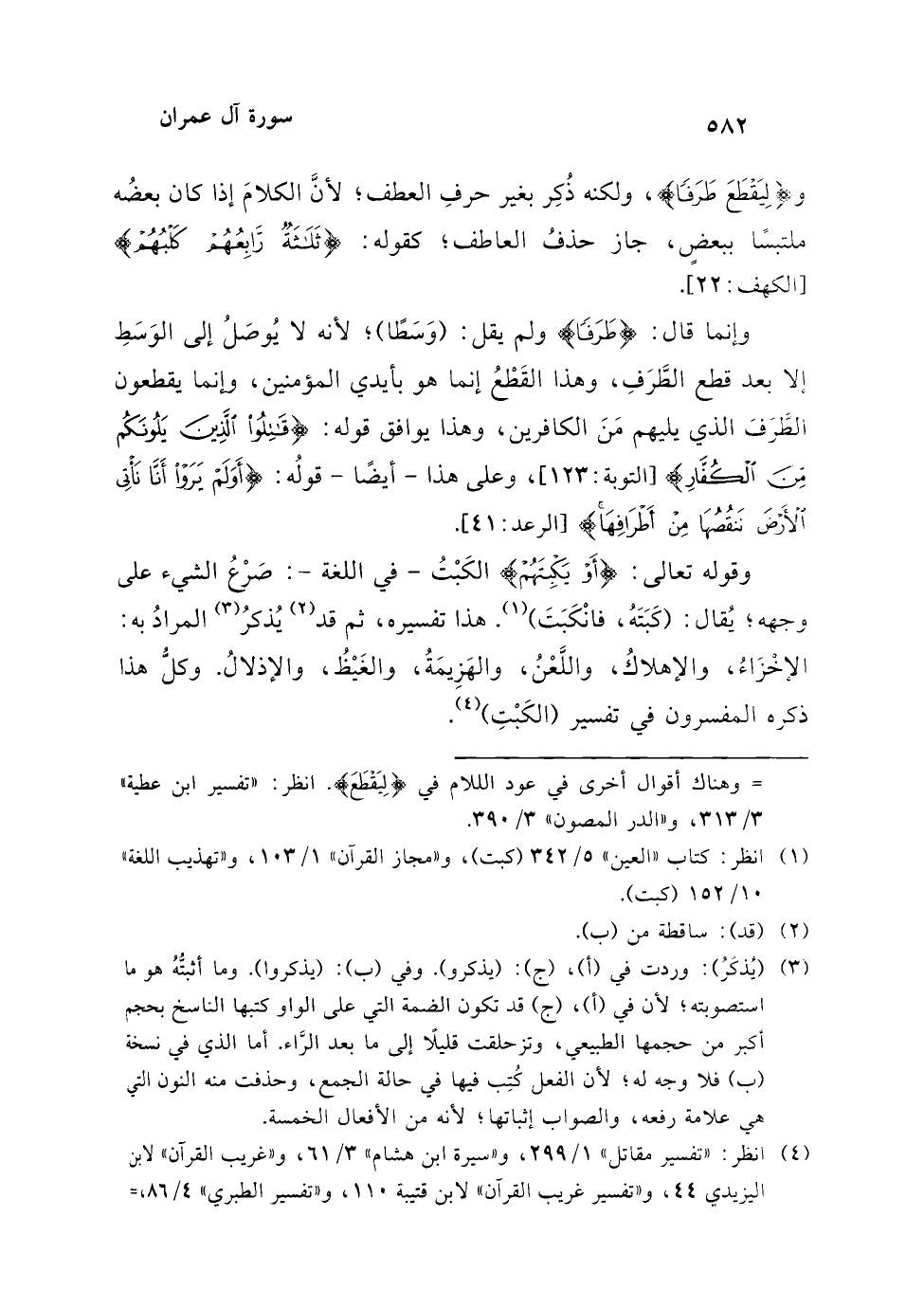 = وهناك أقوال أخرى في عود الللام في {لِيَقْطَعَ}. انظر: "تفسير ابن عطية" 3/ 313، و"الدر المصون" 3/ 390.