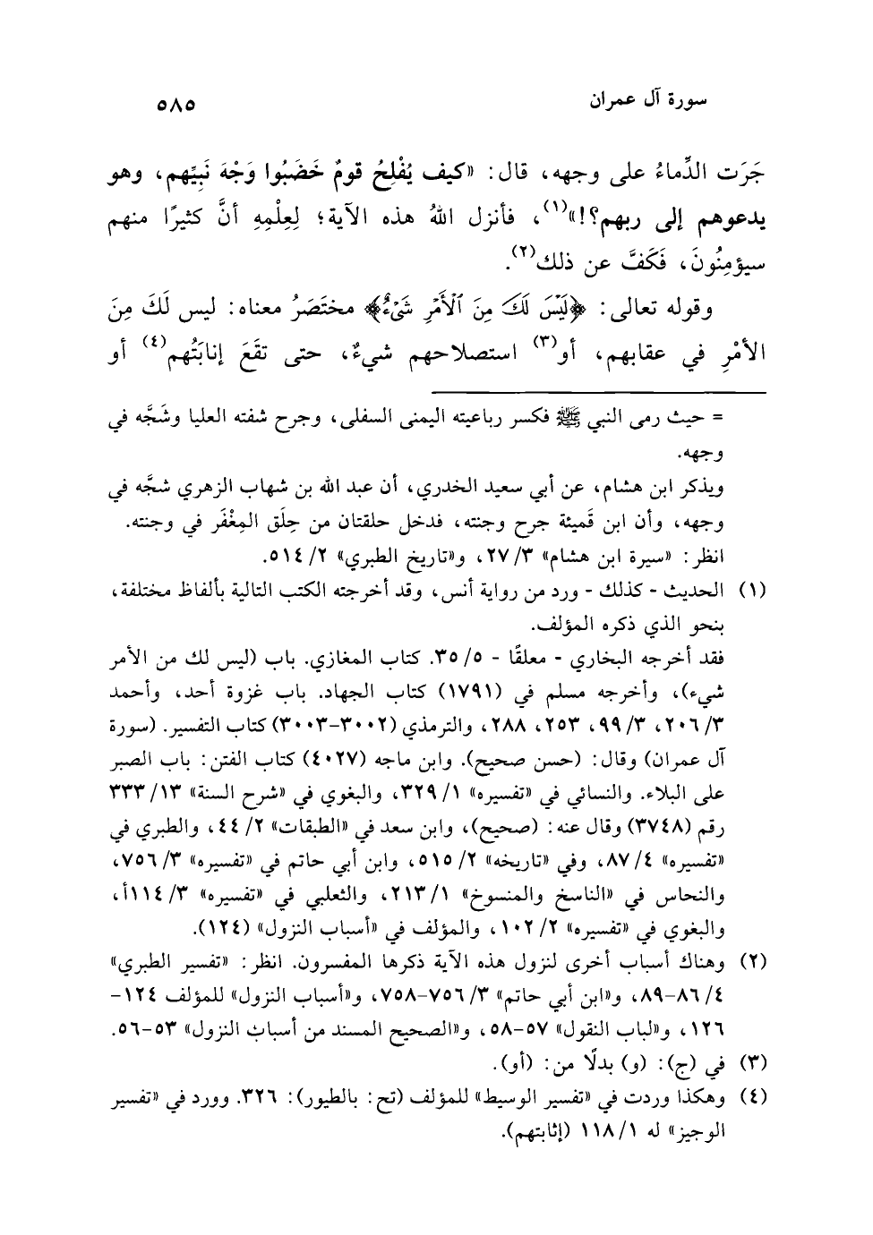 (¬1) الحديث -كذلك- ورد من رواية أنس، وقد أخرجته الكتب التالية بألفاظ مختلفة، بنحو الذي ذكره المؤلف. فقد أخرجه البخاري -معلقًا- 5/ 35. كتاب المغازي. باب (ليس لك من الأمر شيء)، وأخرجه مسلم في (1791) كتاب الجهاد. باب غزوة أحد، وأحمد 3/ 206، 3/ 99، 253، 288، والترمذي (3002 - 3003) كتاب التفسير. (سورة آل عمران) وقال: (حسن صحيح). وابن ماجه (4027) كتاب الفتن: باب الصبر على البلاء. والنسائي في "تفسيره" 1/ 329، والبغوي في "شرح السنة" 13/ 333 رقم (3748) وقال عنه: (صحيح)، وابن سعد في "الطبقات" 2/ 44، والطبري في "تفسيره" 4/ 87، وفي "تاريخه" 2/ 515، وابن أبي حاتم في "تفسيره" 3/ 756، والنحاس في "الناسخ والمنسوخ" 1/ 213، والثعلبي في "تفسيره" 3/ 114 أ، والبغوي في "تفسيره" 2/ 102، والمؤلف في "أسباب النزول" (124).