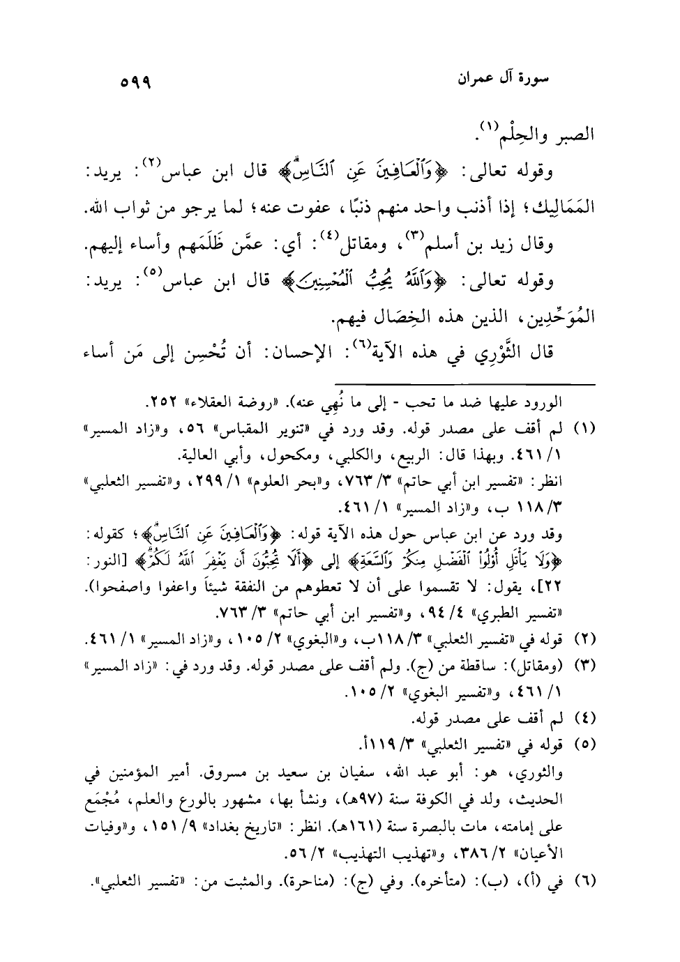 وقد ورد عن ابن عباس حول هذه الآية قوله: {وَالْعَافِينَ عَنِ النَّاسِ} كقوله: {وَلَا يَأْتَلِ أُولُو الْفَضْلِ مِنْكُمْ وَالسَّعَةِ} إلى {أَلَا تُحِبُّونَ أَنْ يَغْفِرَ اللَّهُ لَكُمْ} [النور: 22]، يقول: لا تقسموا على أن لا تعطوهم من النفقة شيئاً واعفوا واصفحوا). "تفسير الطبري" 4/ 94، و"تفسير ابن أبي حاتم" 3/ 763.