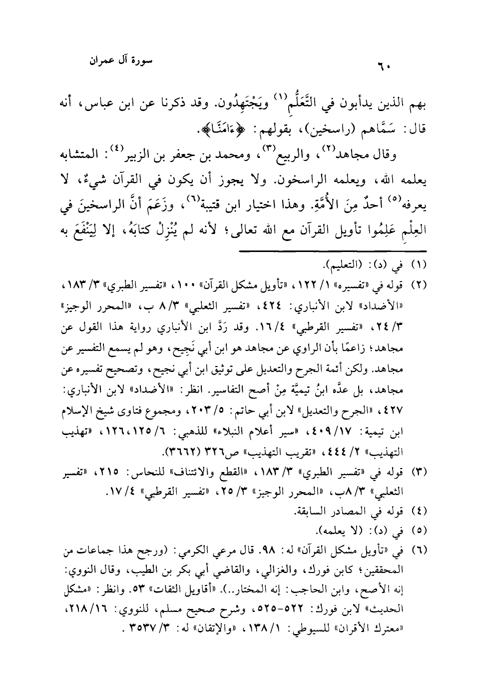 وقال مجاهد (¬2)، والربيع (¬3)، ومحمد بن جعفر بن الزبير (¬4): المتشابه يعلمه الله، ويعلمه الراسخون. ولا يجوز أن يكون في القرآن شيءٌ، لا يعرفه (¬5) أحدٌ مِنَ الأُمَّةِ. وهذا اختيار ابن قتيبة (¬6)، وزَعَمَ أنَّ الراسخينَ في العِلْمِ عَلِمُوا تأويل القرآن مع الله تعالى؛ لأنه لم يُنْزِلْ كتابَهُ، إلا لِيَنْفَعَ به