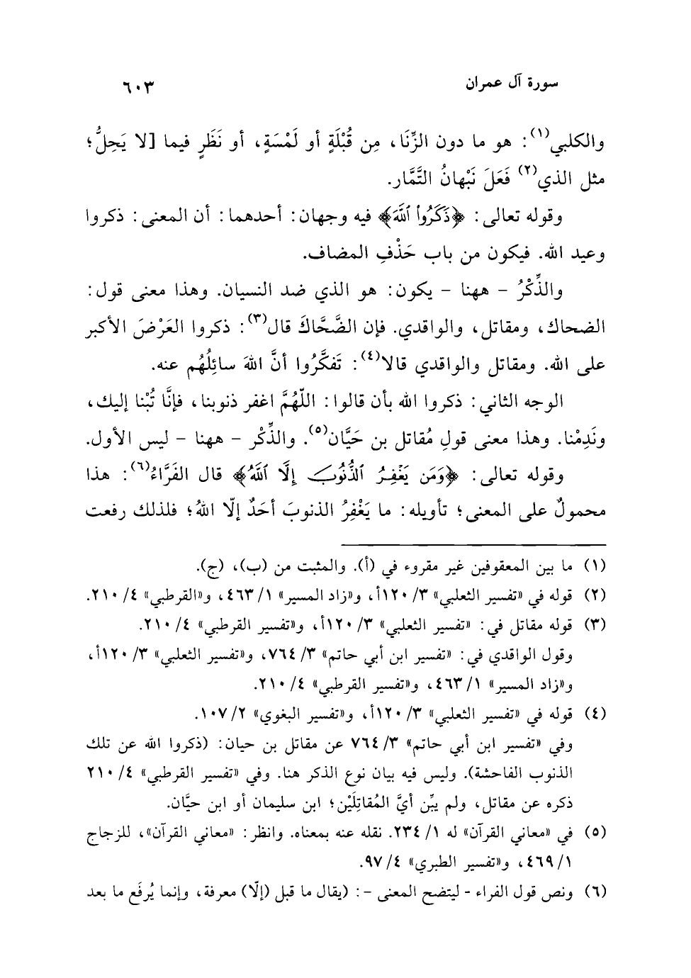 وفي "تفسير ابن أبي حاتم" 3/ 764 عن مقاتل بن حيان: (ذكروا الله عن تلك الذنوب الفاحشة). وليس فيه بيان نوع الذكر هنا. وفي "تفسير القرطبي" 4/ 210 ذكره عن مقاتل، ولم يبِّن أيَّ المُقاتِلَيْن، ابن سليمان أو ابن حيَّان.