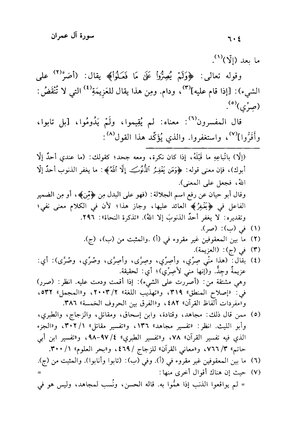 قال المفسرون (¬6): معناه: لم يُقِيموا، ولَمْ يَدُومُوا، [بل تابوا، وأَقَرُّوا] (¬7)، واستغفروا. والذي يُؤَكِّد هذا القول (¬8):