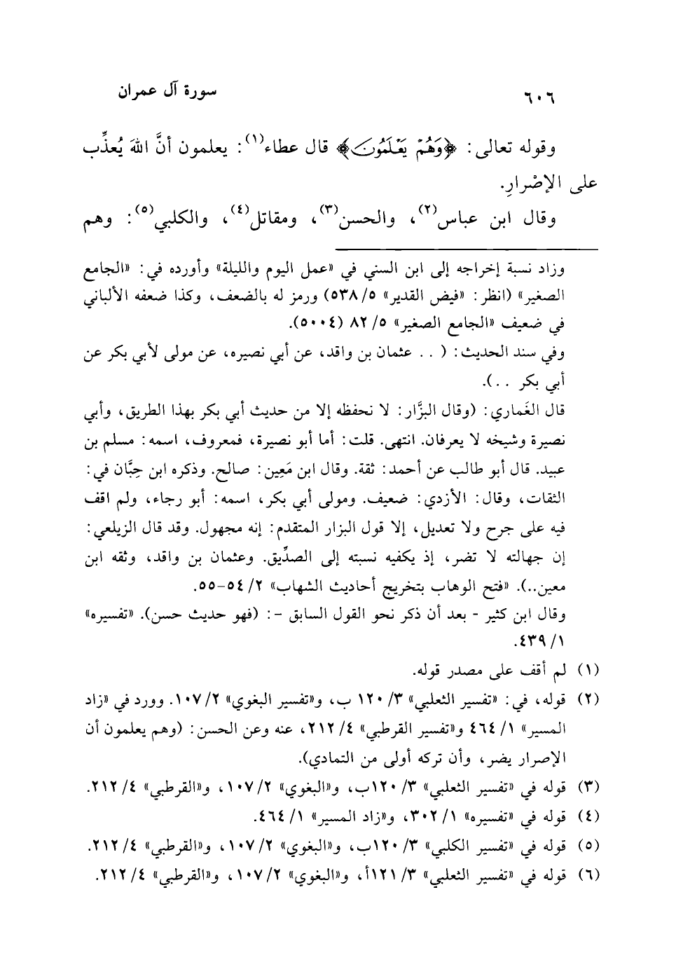 (¬2) قوله، في: "تفسير الثعلبي" 3/ 120 ب، و"تفسير البغوي" 2/ 107. وورد في "زاد المسير" 1/ 464 و"تفسير القرطبي" 4/ 212، عنه وعن الحسن: (وهم يعلمون أن الإصرار يضر، وأن تركه أولى من التمادي).