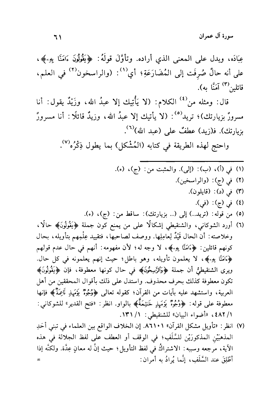 (¬6) أورد الشوكاني، والشنقيطي إشكالًا على من يمنع كون جملة {يَقُولُونَ} حالًا، وخلاصته: أن الحال قَيْدٌ لِعامِلِها. ووصف لصاحبها، فتقييد عِلْمِهم بتأويله، بحال كونهم قائلين: {آمَنَّا بِهِ}، لا وجه له؛ لأن مفهومه: أنهم في حال عدم قولهم {آمَنَّا بِهِ}، لا يعلمون تأويله، وهو باطل؛ حيث إنهم يعلمونه في كل حال. ويرى الشنقيطي أن جملة {وَالرَّاسِخُونَ} في حال كونها معطوفة، فإن {يَقُولُونَ} تكون معطوفة كذلك بحرف محذوف. واستدل على ذلك بأقوال المحققين من أهل العربية، واستشهد عليه بآيات من القرآن؛ كقوله تعالى {وُجُوهٌ يَوْمَئِذٍ نَاعِمَةٌ} فإنها معطوفة على قوله: {وُجُوهٌ يَوْمَئِذٍ خَاشِعَةٌ} بالواو. انظر: "فتح القدير" للشوكاني: 1/ 482، "أضواء البيان" للشنقيطي: 1/ 131.