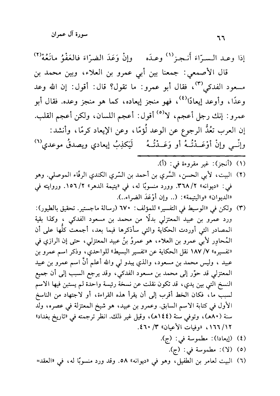 (¬3) ولكن في "الوسيط في التفسير" للمؤلف: 670 (رسالة ماجستير. تحقيق بالطيور): ورد عمرو بن عبيد المعتزلي بدلًا من محمد بن مسعود الفدكي، وكذا بقية المصادر التي أوردت الحكاية والتي سأذكرها فيما بعد، أجمعت كلُّها على أن المُحاوِر لأبي عمرو بن العلاء، هو عمروُ بنُ عبيد المعتزلي، حتى إن الرازي في "تفسيره" 7/ 187 نقل الحكاية عن "تفسير البسيط" للواحدي، وذكر اسم عمرو بن عبيد، وليس محمد بن مسعود، والذي يبدو لي والله أعلم أنَّ اسم عمرو بن عبيد المعتزلي قد حوِّر إلى محمد بن مسعود الفدكي، وقد يرجع السبب إلى أن جميع النسخ التي بين يدي، قد تكون نقلت عن نسخة رئيسة واحدة لم يستبن فيها الاسم لسبب ما، فكان الخط أقرب إلى أن يقرأ هذه القراءة، أو لاجتهاد من الناسخ الأول في كتابة الاسم السابق. وعمرو بن عبيد، هو شيخ المعتزلة في عصره، ولد سنة (80 هـ)، وتوفي سنة (144 هـ)، وقيل غير ذلك. انظر ترجمته في "تاريخ بغداد" 12/ 166، "وفيات الأعيان" 3/ 460.