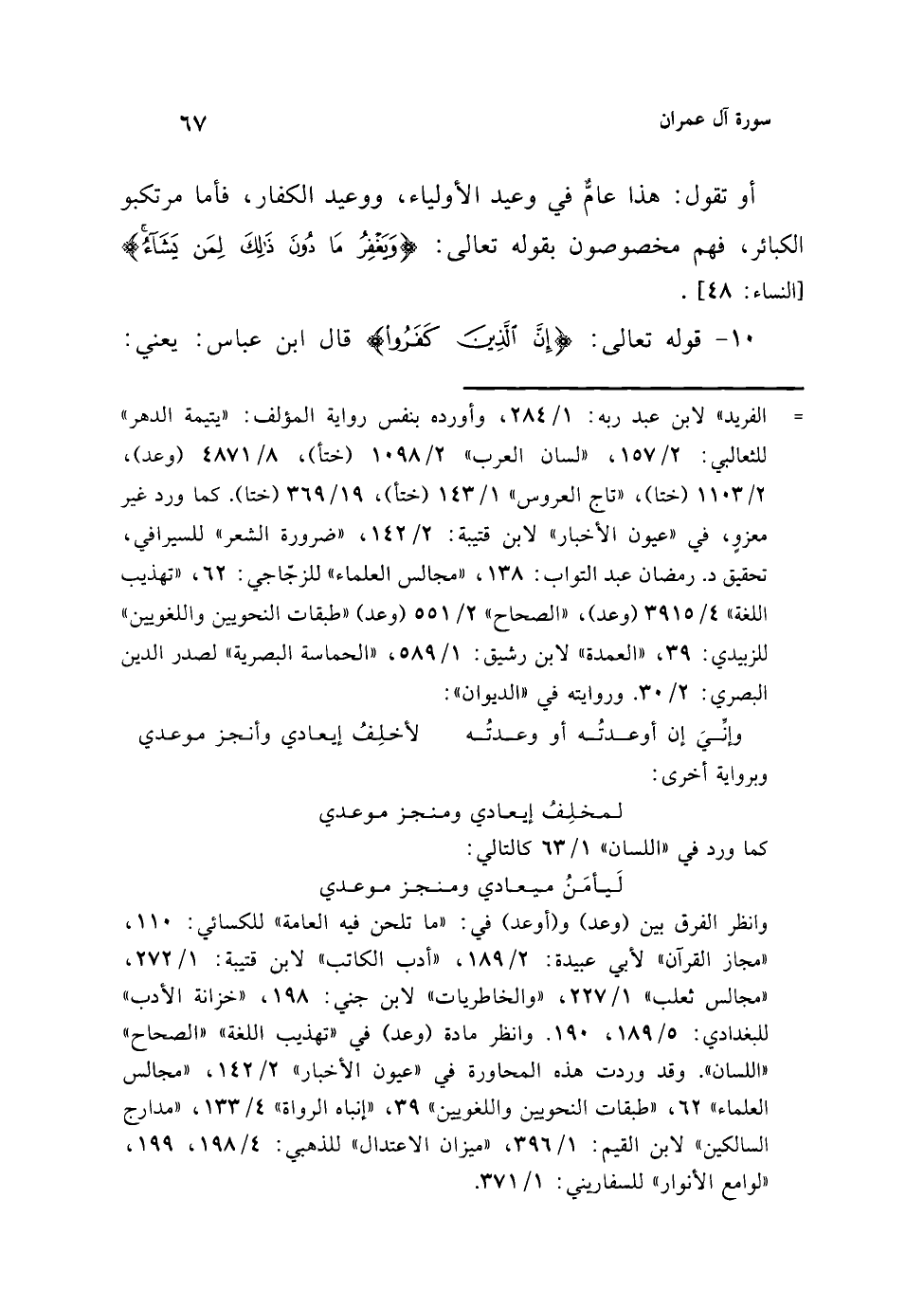 أو تقول: هذا عامٌّ في وعيد الأولياء، ووعيد الكفار، فأما مرتكبو الكبائر، فهم مخصوصون بقوله تعالى: {وَيَغْفِرُ مَا دُونَ ذَلِكَ لِمَنْ يَشَاءُ} [النساء: 48].
