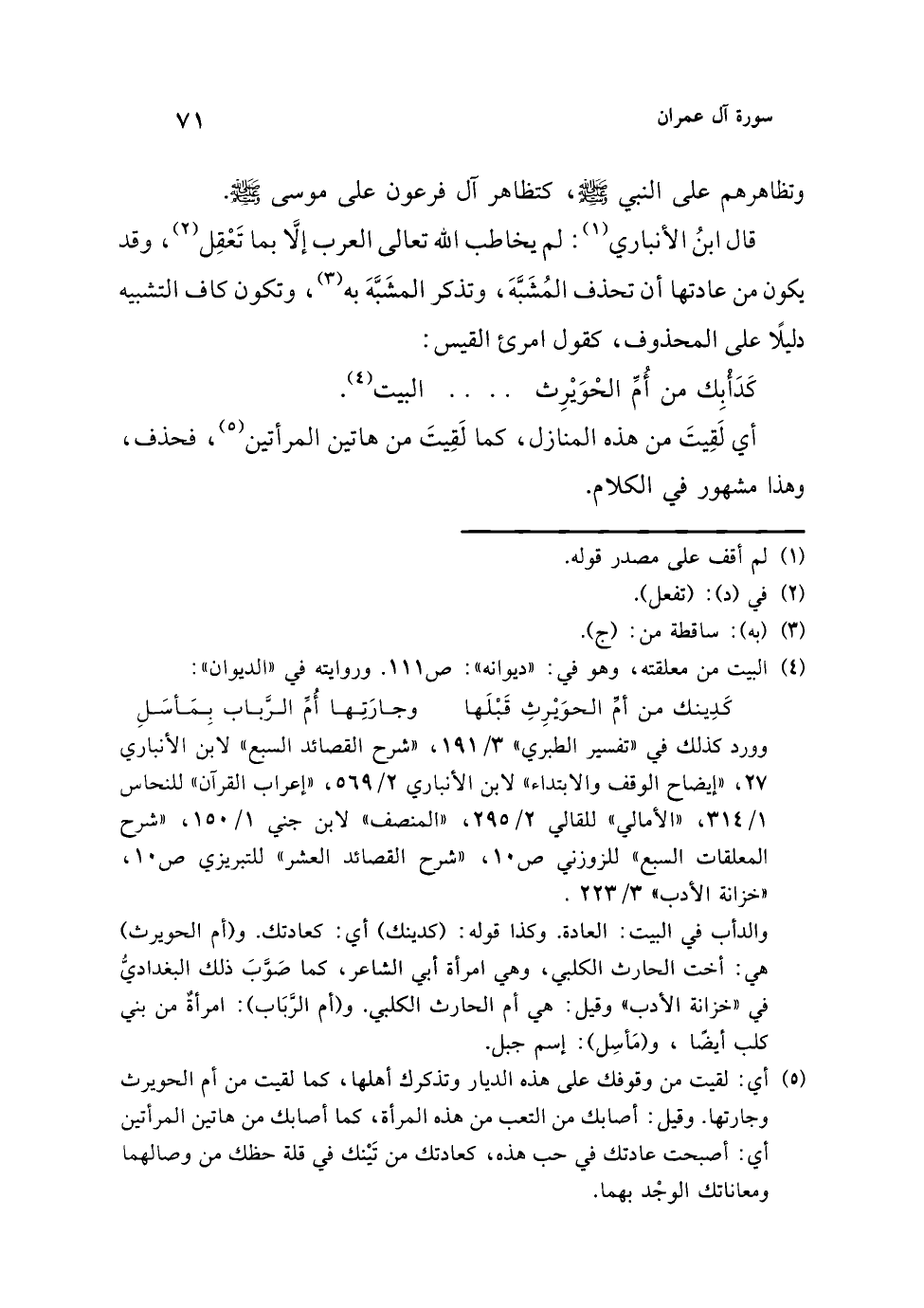 وورد كذلك في "تفسير الطبري" 3/ 191، "شرح القصائد السبع" لابن الأنباري 27، "إيضاح الوقف والابتداء" لابن الأنباري 2/ 569، "إعراب القرآن" للنحاس 1/ 314، "الأمالي" للقالي 2/ 295، "المنصف" لابن جني 1/ 150، "شرح المعلقات السبع" للزوزني ص 10، "شرح القصائد العشر" للتبريزي ص 10، "خزانة الأدب" 3/ 223.