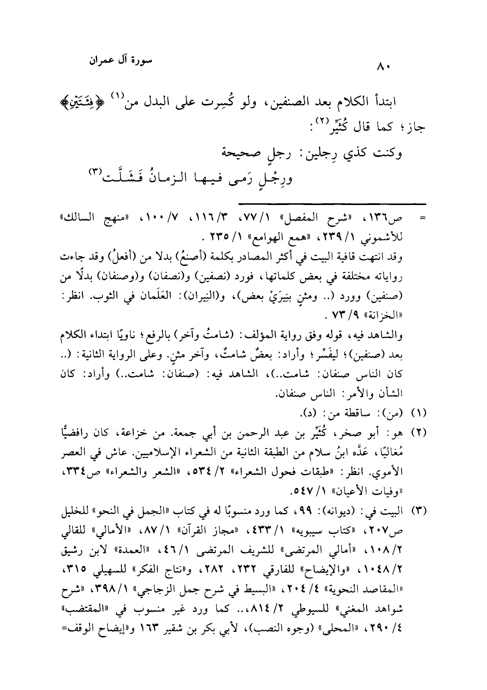 والشاهد فيه، قوله وفق رواية المؤلف: (شامتُ وآخر) بالرفع؛ ناويًا ابتداء الكلام بعد (صنفين)؛ ليفَسِّر؛ وأراد: بعضٌ شامتٌ، وآخر مثنٍ. وعلى الرواية الثانية: (.. كان الناس صنفان: شامت ..)، الشاهد فيه: (صنفان: شامت ..) وأراد: كان الشأن والأمر: الناس صنفان.