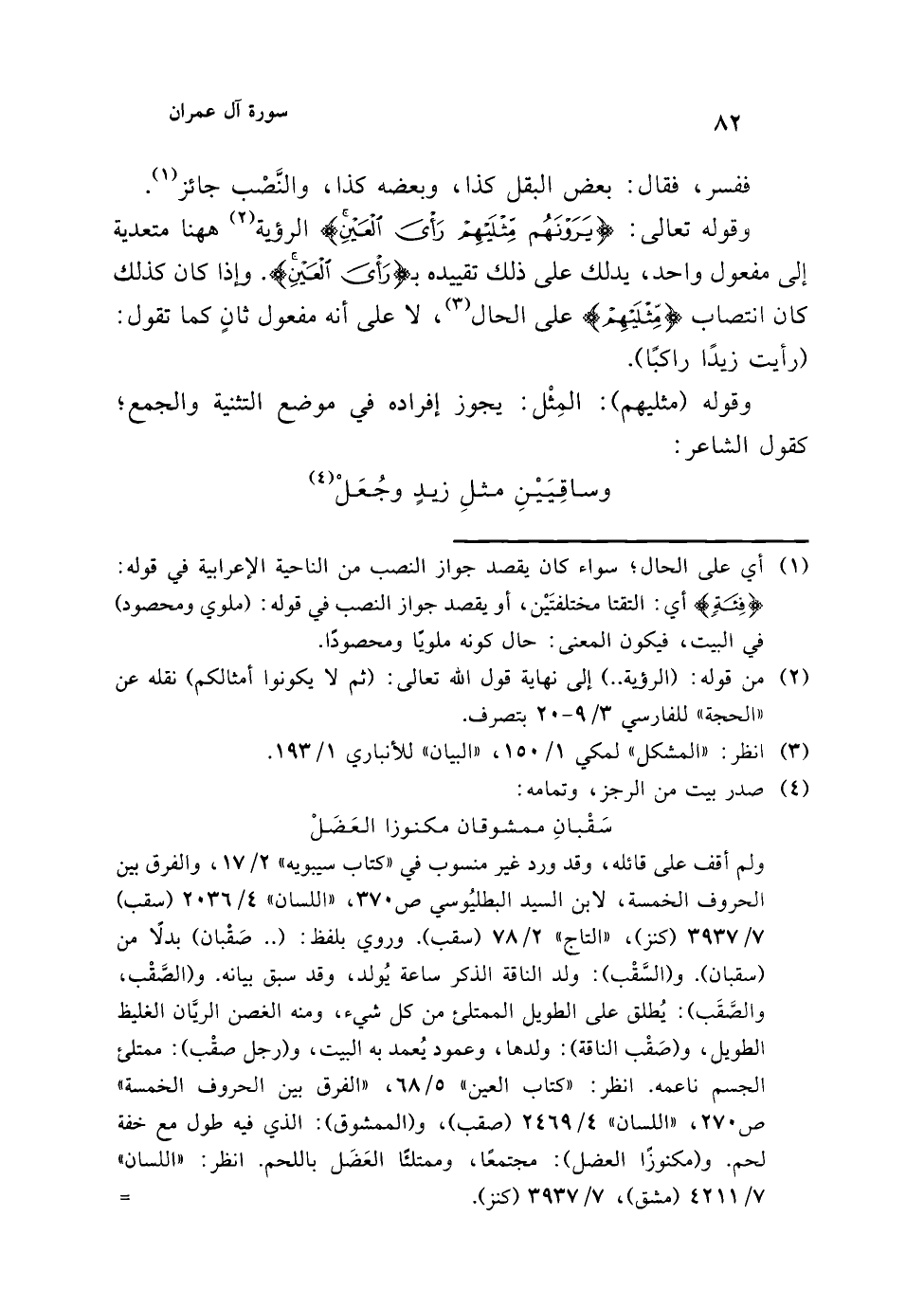 وقوله تعالى: {يَرَوْنَهُمْ مِثْلَيْهِمْ رَأْيَ الْعَيْنِ} الرؤية (¬2) ههنا متعدية إلى مفعول واحد، يدلك على ذلك تقييده بـ {رَأْيَ الْعَيْنِ}. وإذا كان كذلك كان انتصاب {مِثْلَيْهِمْ} على الحال (¬3)، لا على أنه مفعول ثانٍ كما تقول: (رأيت زيدًا راكبًا).
