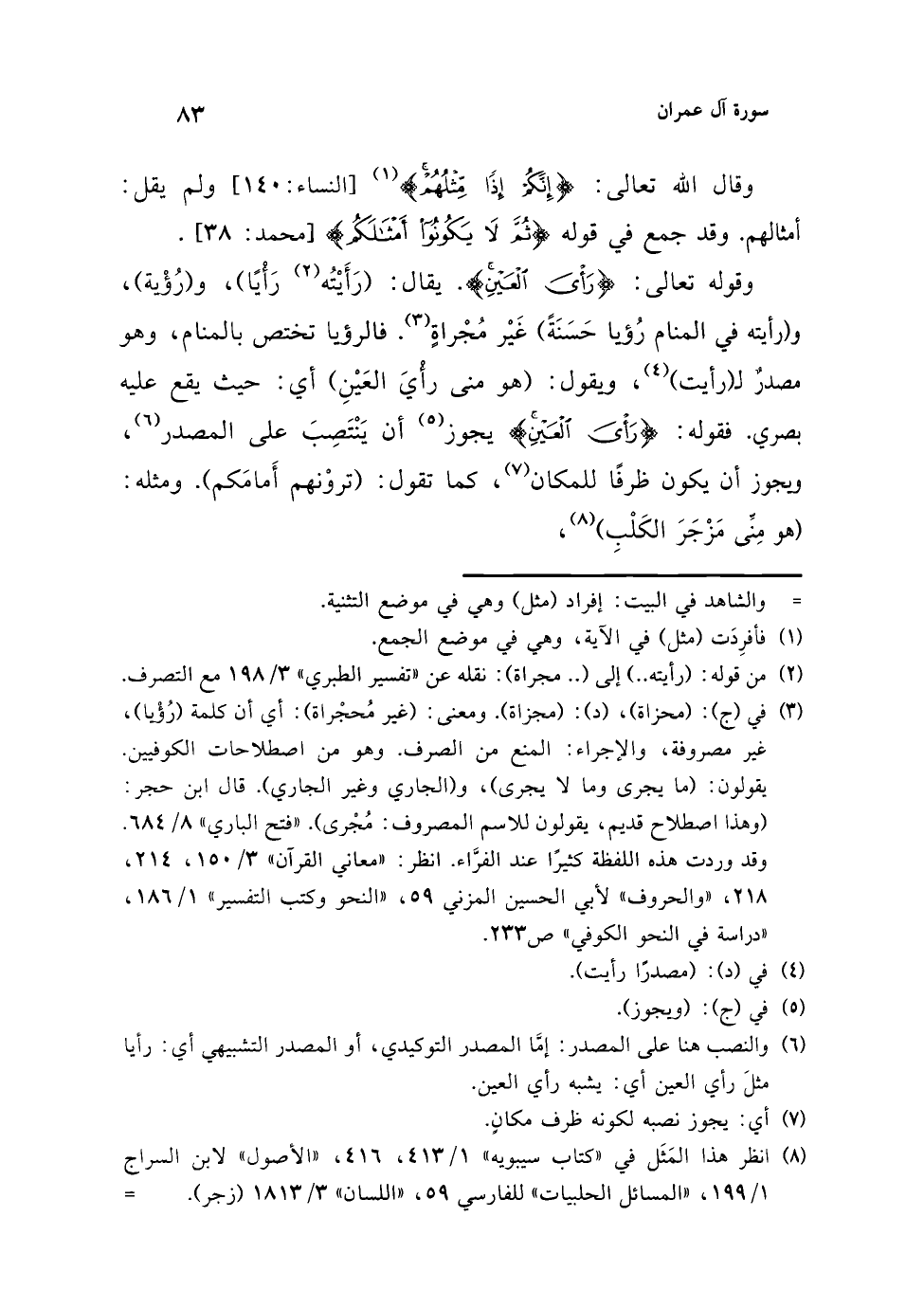 وقوله تعالى: {رَأْيَ الْعَيْنِ}. يقال: (رَأَيْتُه (¬2) رَأيًا)، و (رُؤْية)، و (رأيته في المنام رُؤيا حَسَنَةً) غَيْر مُجْراةٍ (¬3). فالرؤيا تختص بالمنام، وهو مصدرٌ لـ (رأيت) (¬4)، ويقول: (هو منى رأْيَ العَيْنِ) أي: حيث يقع عليه بصري. فقوله: {رَأْيَ الْعَيْنِ} يجوز (¬5) أن يَنْتَصِبَ عدى المصدر (¬6)، ويجوز أن يكون ظرفًا للمكان (¬7)، كما تقول: (تروْنهم أَمامَكم). ومثله: (هو مِنِّى مَزْجَرَ الكَلْبِ) (¬8)،