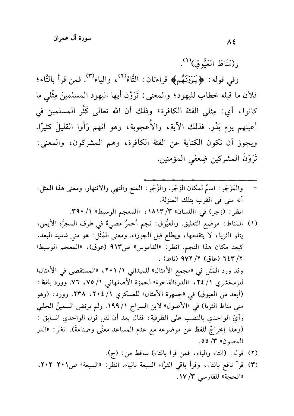 وفي قوله: {يَرَوْنَهُمْ} قراءتان: التَّاءُ (¬2)، والياء (¬3). فمن قرأ بالتَّاء؛ فلأن ما قبله خطاب لليهود؛ والمعنى: تَرَوْن أيها اليهود المسلمينَ مِثْلي ما كانوا، أي: مِثْلي الفئة الكافرة؛ وذلك أن الله تعالى كَثَّر المسلمين في أعينهم يوم بَدْر. فذلك الآية، والأُعجوبة، وهو أنهم رَأَوا القليلَ كثيرًا. ويجوز أن تكون الكناية عن الفئة الكافرة، وهم المشركون، والمعنى: تَرَوْنَ المشركين ضِعفي المؤمنين.