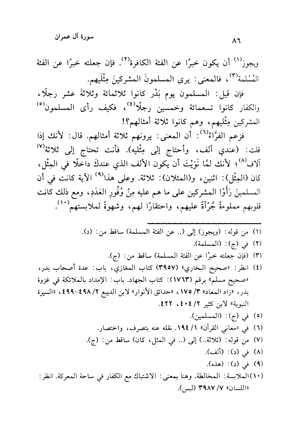 فزعم الفرَّاءُ (¬6): أن المعنى: يرونهم ثلاثة أمثالهم. قال: لأنك إذا قلت: (عندي ألف، وأحتاج إلى مِثليه). فأنت تحتاج إلى ثلاثة (¬7) آلاف (¬8)؛ لأنك لمَّا نَوَيْتَ أن يكون الألف الذي عندكَ داخلًا في المِثْل، كان (المِثْل): اثنين، و (المثلان): ثلاثة. وعلى هذا (¬9) الآية كانت في أن المسلمينَ رَأَوْا المشركين على ما هم عليه مِنْ وُفُورِ العَدَدِ، ومع ذلك كانت قلوبهم مملوءةً جُرْأةً عليهم، واحتقارًا لهم، وشهوةً لملابستهم (¬10).