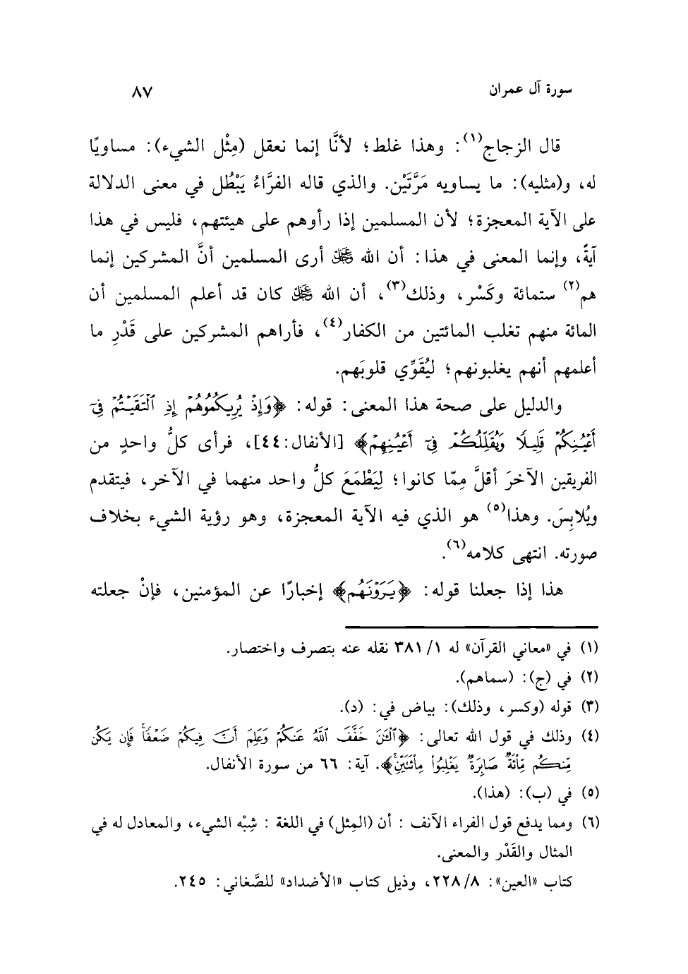 قال الزجاج (¬1): وهذا غلط؛ لأنَّا إنما نعقل (مِثْل الشيء): مساويًا له، و (مثليه): ما يساويه مَرَّتَيْن. والذي قاله الفرَّاءُ يَبْطُل في معنى الدلالة على الآية المعجزة؛ لأن المسلمين إذا رأوهم على هيئتهم، فليس في هذا آيةً، وإنما المعنى في هذا: أن الله عز وجل أرى المسلمين أنَّ المشركين إنما هم (¬2) ستمائة وكَسْر، وذلك (¬3)، ان الله عز وجل كان قد أعلم المسلمين أن المائة منهم تغلب المائتين من الكفار (¬4)، فأراهم المشركين على قَدْرِ ما أعلمهم أنهم يغلبونهم؛ ليُقَوِّي قلوبَهم.