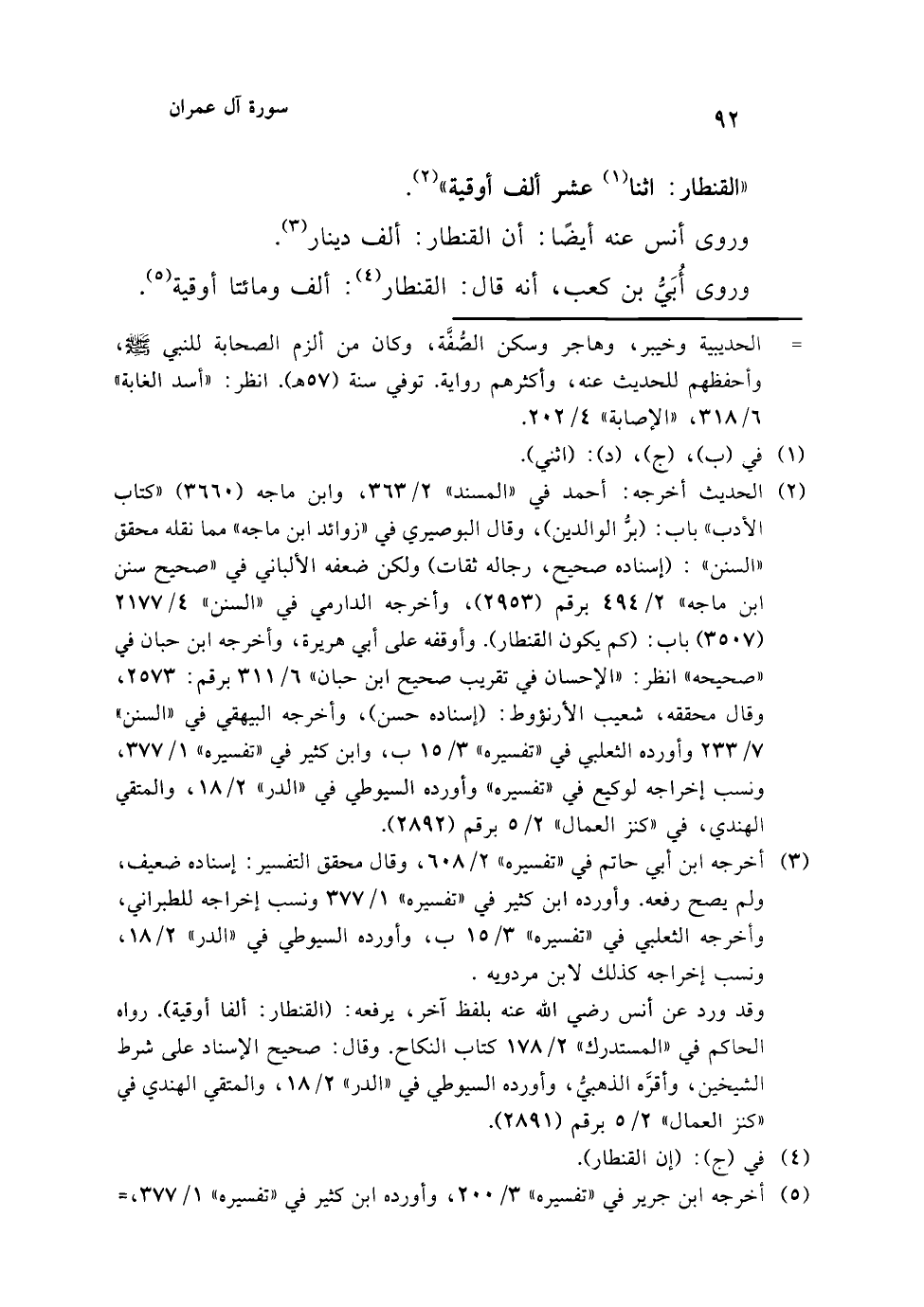 وقد ورد عن أنس رضي الله عنه بلفظ آخر، يرفعه: (القنطار: ألفا أوقية). رواه الحاكم في "المستدرك" 2/ 178 كتاب النكاح. وقال: صحيح الإسناد على شرط الشيخين، وأقرَّه الذهبيُّ، وأورده السيوطي في "الدر" 2/ 18، والمتقي الهندي في "كنز العمال" 2/ 5 برقم (2891).