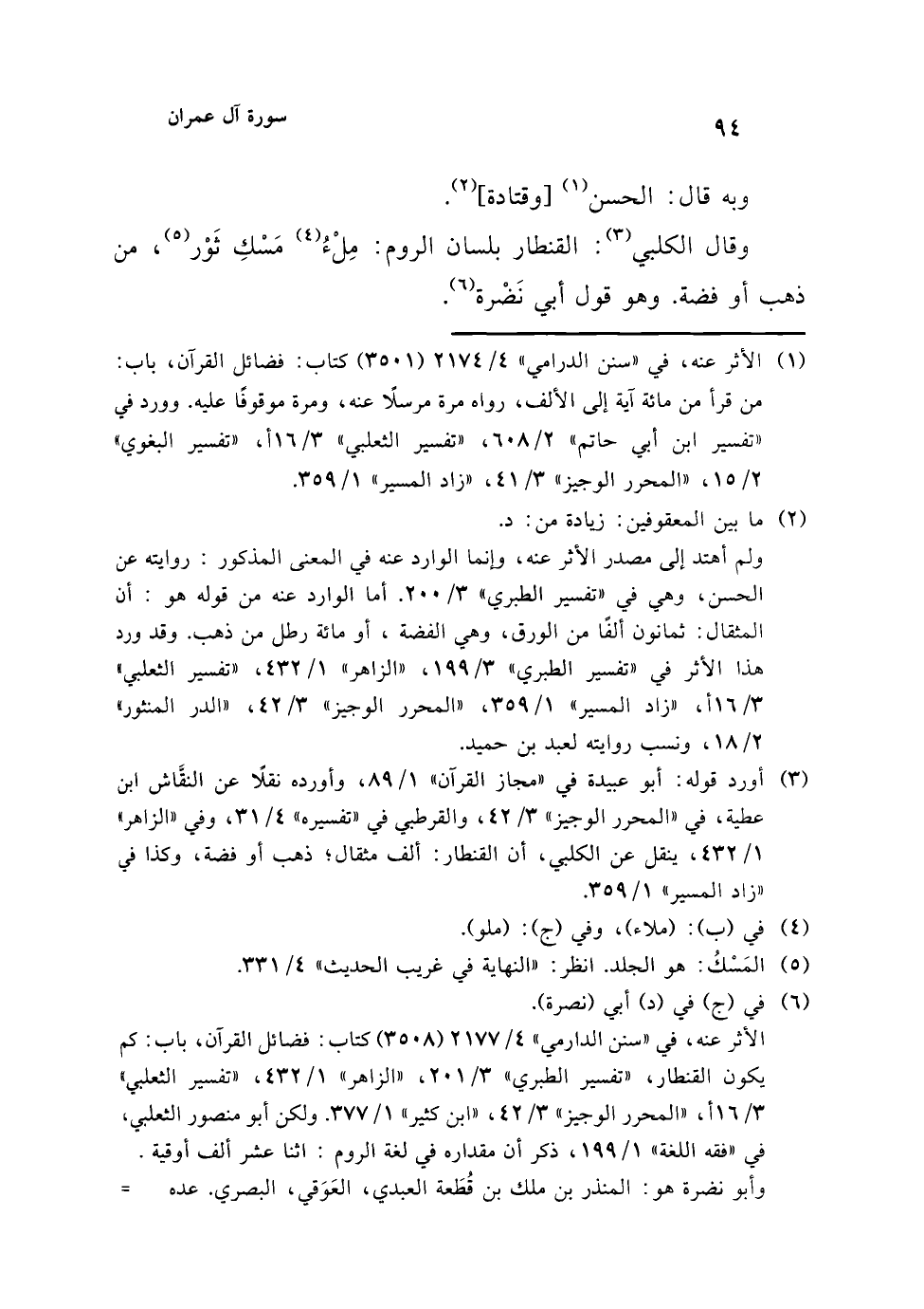 الأثر عنه، في "سنن الدارمي" 4/ 2177 (3508) كتاب: فضائل القرآن، باب: كم يكون القنطار، "تفسير الطبري" 3/ 201، "الزاهر" 1/ 432، "تفسير الثعلبي" 3/ 16 أ، "المحرر الوجيز" 3/ 42، "ابن كثير" 1/ 377. ولكن أبو منصور الثعلبي، في "فقه اللغة" 1/ 199، ذكر أن مقداره في لغة الروم: اثنا عشر ألف أوقية. وأبو نضرة هو: المنذر بن ملك بن قُطَعة العبدي، العَوَقي، البصري. عده ابن حجر من الطبقة الوسطى من التابعين، ثقة، توفي سنة (108هـ) أو (109هـ). انظر: "سير أعلام النبلاء" 4/ 129، "تقريب التهذيب" (6890)، "تهذيب التهذيب" 4/ 154.