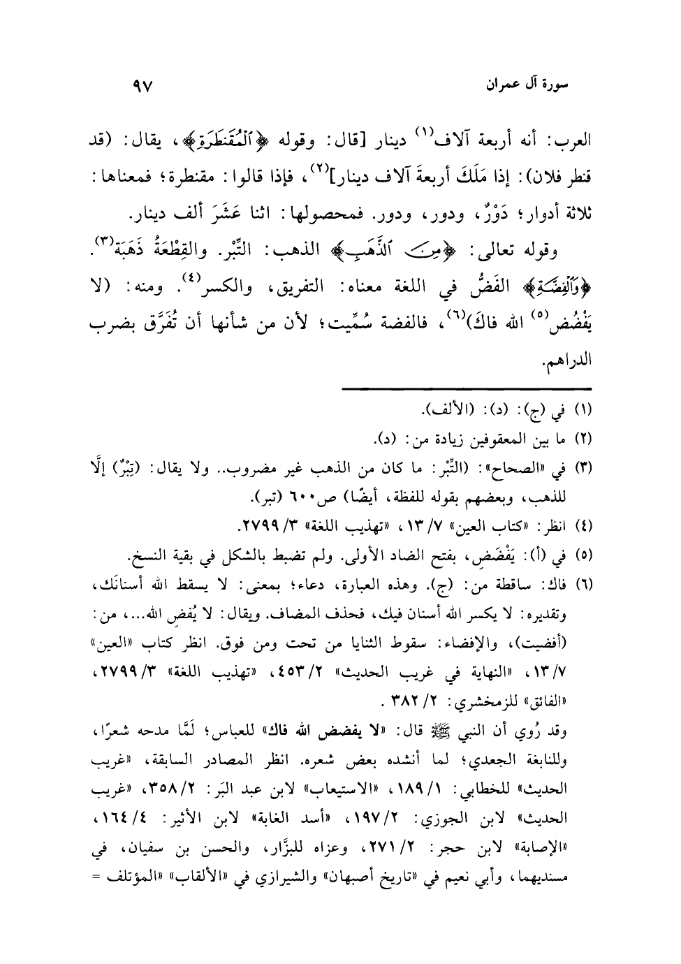 وقوله تعالى: {مِنَ اَلذَّهَبِ} الذهب: التِّبْر. والقِطْعَةُ ذَهَبَة (¬3). {وَالْفِضَّةِ} الفَضُّ في اللغة معناه: التفريق، والكسر (¬4). ومنه: (لا يَفْضُض (¬5) الله فاكَ) (¬6)، فالفضة سُمِّيت؛ لأن من شأنها أن تُفَرَّق بضرب الدراهم.