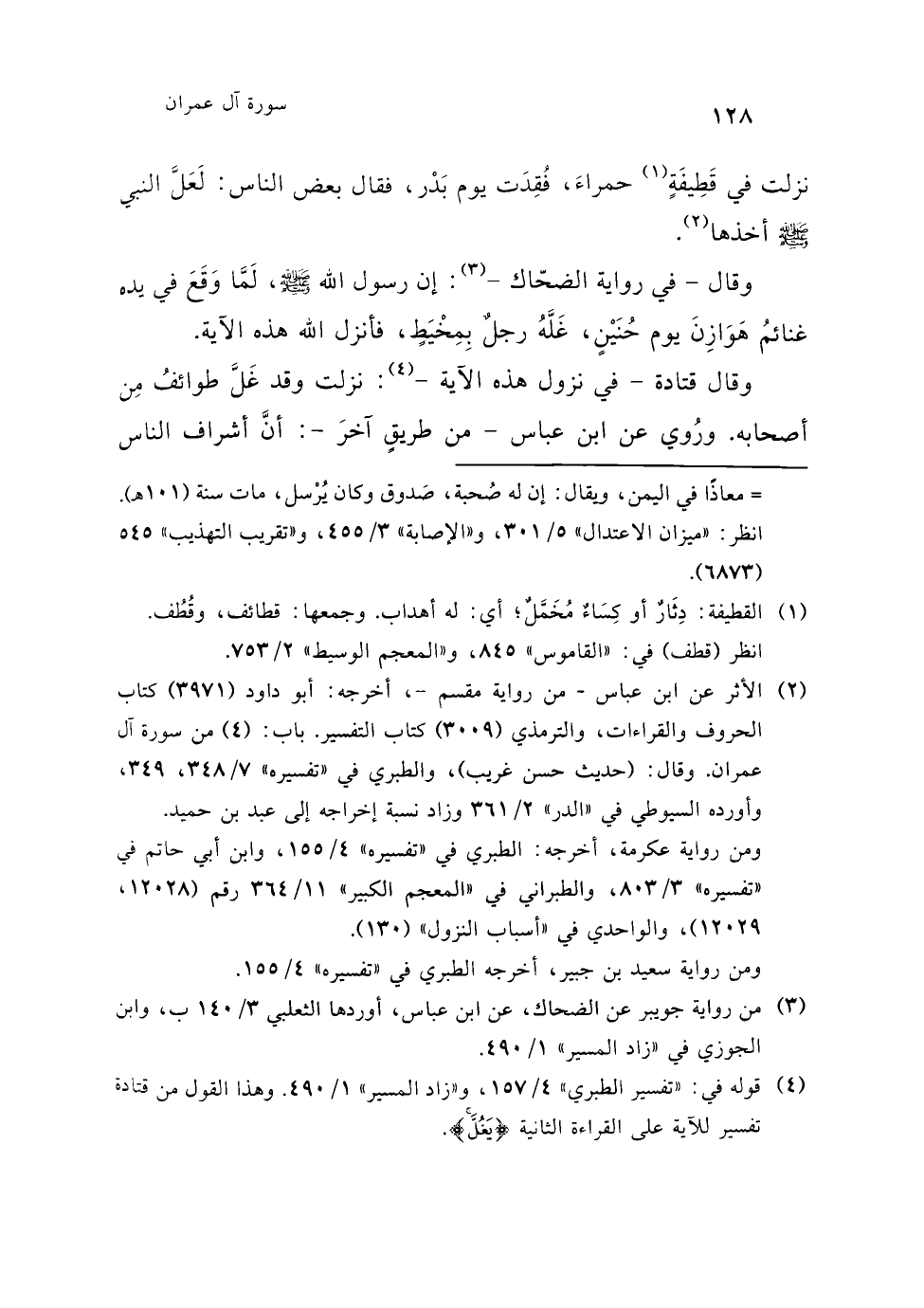 (¬8) هكذا وردت (فيكم) في (أ)، (ب)، (ج)، و"تفسير الوسيط" المؤلف 371. وأرى أن الأصوب أن تكون: (فيكتم)؛ لأنه أنسب للسياق الذي أراد المؤلف من خلاله أن يُدلِّل على أن معنى (الغل) -هنا- فيه كتمان وكمون وستر، وهو أنسب بسبب النزول الذي أورده المؤلف سابقًا، وأشار إليها هنا. ويعزز هذا ما قاله في تفسيره "الوجيز": (أي: يخون بكتمان شيء من الغنيمة عن أصحابه) 1/ 240.