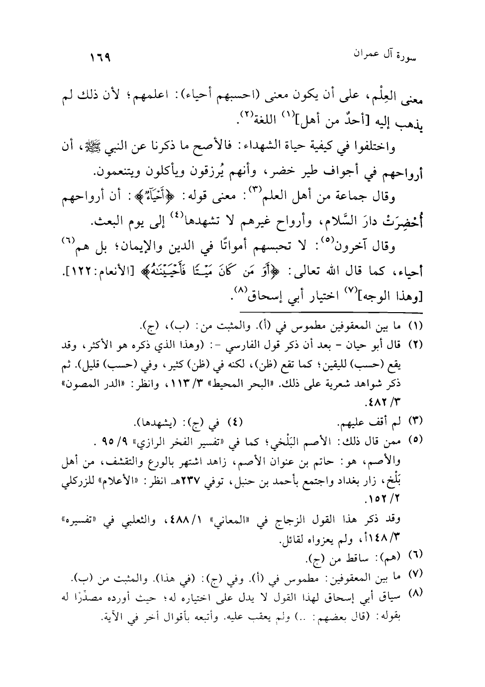 والثاني: هم أحياء عند ربهم؛ أي: في عِلْمِهِ بِعَمَلِهِم، -كذلك- كما تقول: (هذا عند الشافعي كذا)؛ أي: في عِلْمِهِ وقولِه.