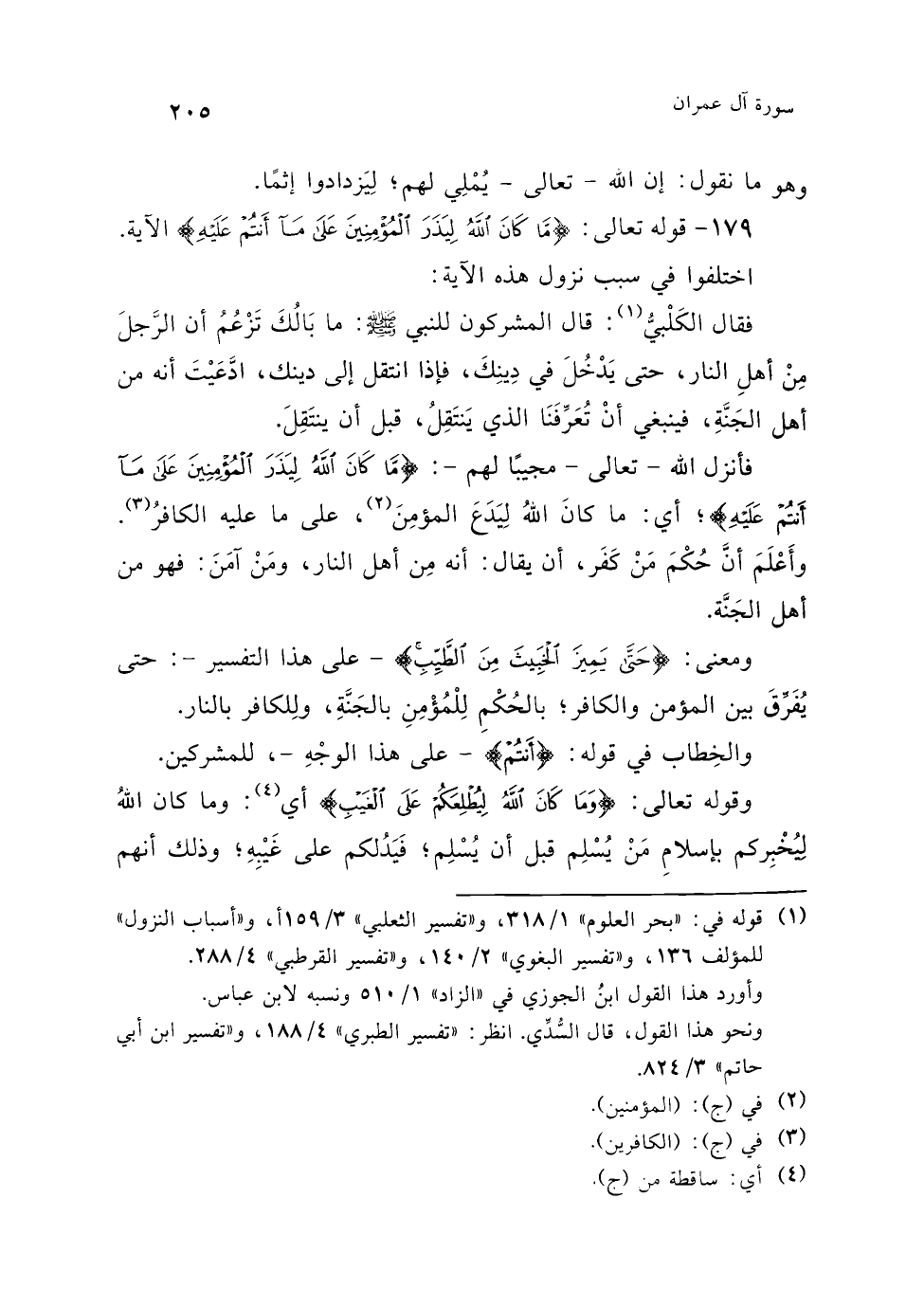 {وَمَا كَانَ اللَّهُ لِيُطْلِعَكُمْ عَلَى الْغَيْبِ} فتعرفوا المنافقَ من المؤمنِ قبل التمييز، ولكنَّ اللهَ يختار بمعرفة (¬2) ذلك مَنْ يَشَاء مِنَ الرُّسُلِ.
