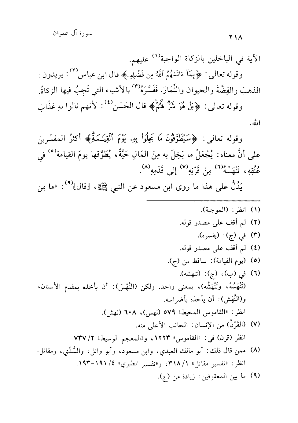 السَّعْدِي (¬1)، ثنا موسى بن بحر (¬2)، ثنا عَبِيدة بن (¬3) حُمَيْد (¬4) , حدّثَنِي منصور (¬5)، عن إبراهيم (¬6) -في قوله: {سَيُطَوَّقُونَ مَا بَخِلُوا بِهِ يَوْمَ الْقِيَامَةِ} -، قال: (يُطَوَّقون بِطَوْقٍ (¬7) منْ نار) (¬8).