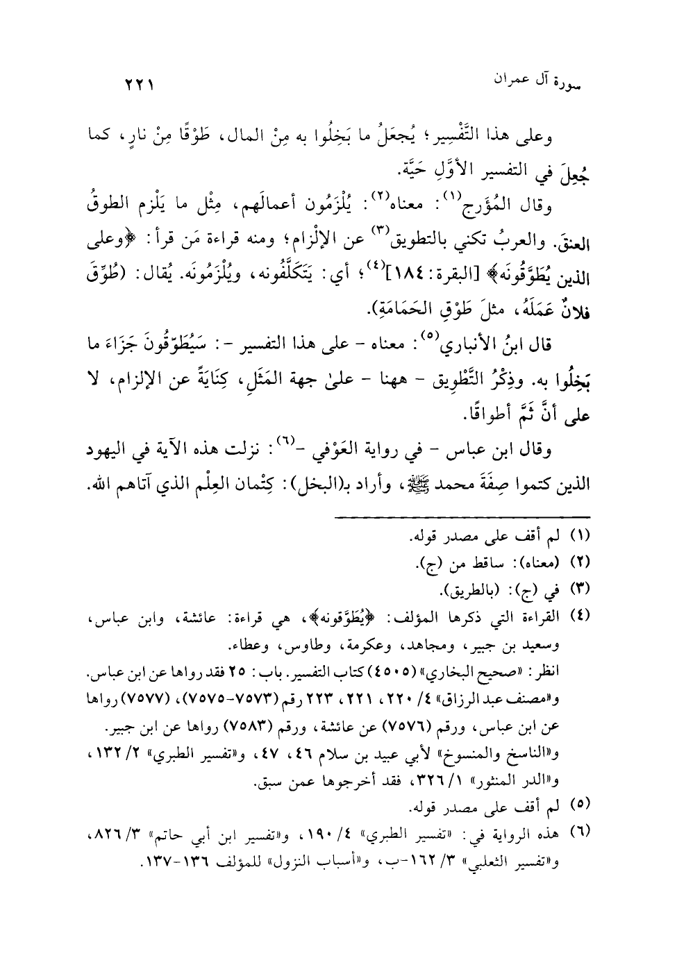 مَنْ قَرَأَ بالياءِ (¬7)، فلأنَّ ما قَبْلَهُ على الغَيْبَةِ، وذلك قوله: {سَيطَوَّقُونَهُ} (¬8)، {والله بِمَا يَعملون (¬9) خبير} مِنْ مَنْعِهِم الحقوقَ، فَيُجَازِيهم عليه.