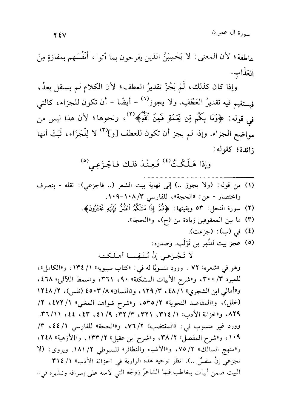 ووجه هذه القراءة: أنه حذف (¬6) المفعولَ الثاني الذي يقتضيه {تَحْسَبَنَّ} الأول؛ لأن ما يجيء بَعدُ من قوله: {فَلَا تَحْسَبَنَّهُمْ} , يدل عليه.