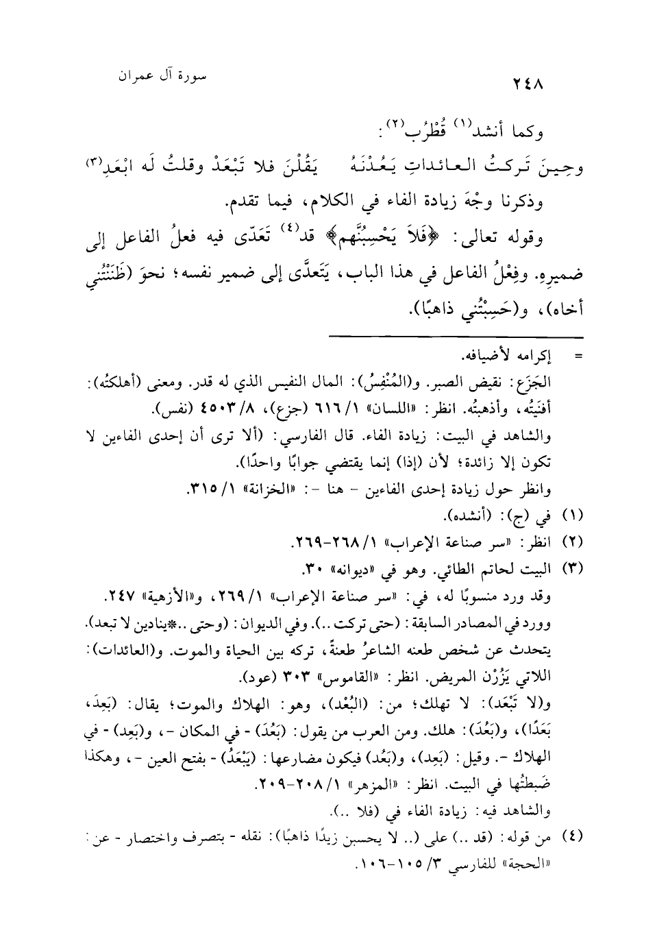 (¬8) أي: {يَحْسَبَنَّ} و {تَحْسَبَنَّهُمْ}، وكسرَ نافعٌ السينَ وفتحها ابنُ عامر. انظر: "السبعة" 219 - 220، و"علل القراءات" 1/ 131، و"الحجة" للفارسي 3/ 101