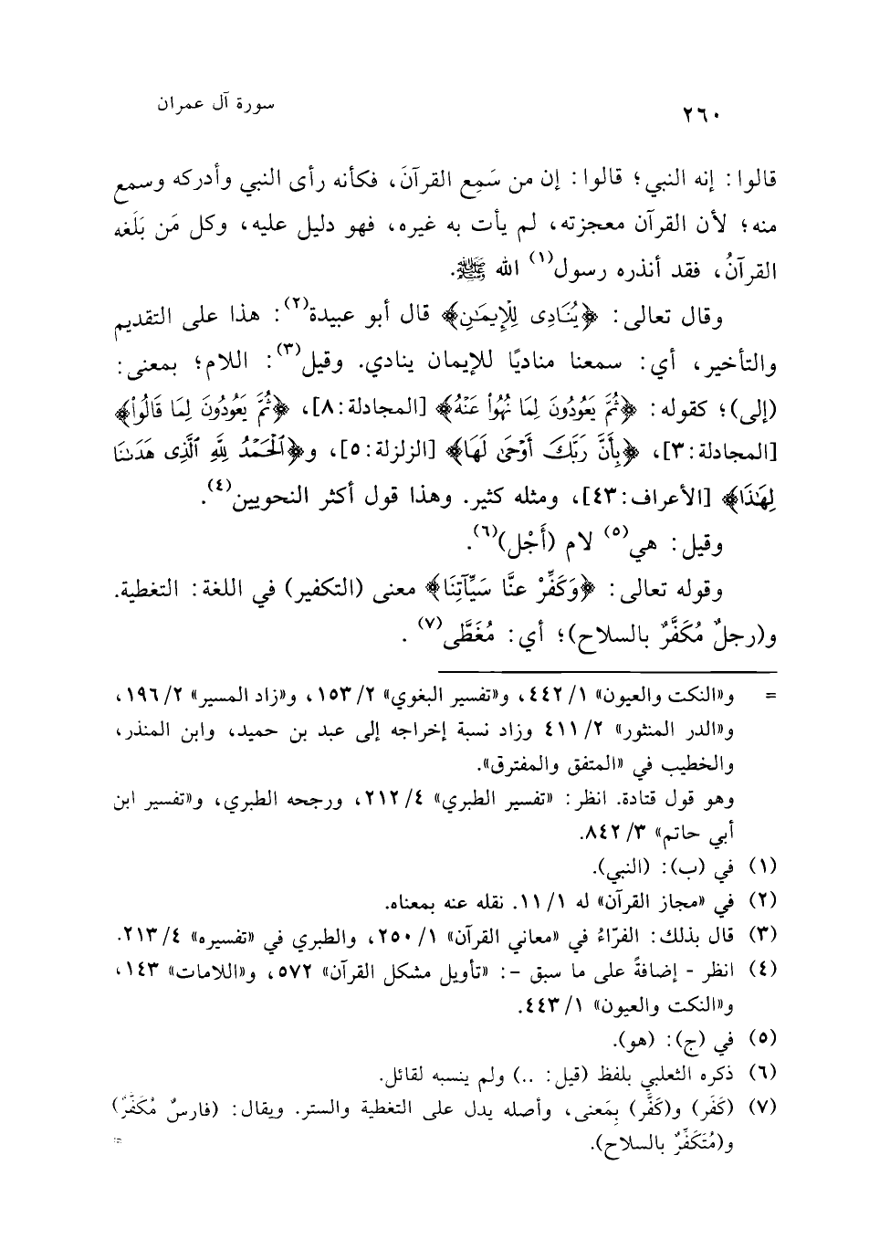 (¬5) انظر: "تفسير الطبري" 4/ 213، و"بحر العلوم" 1/ 324، و"تفسير الثعلبي" 3/ 173 أ، و"زاد المسير" 1/ 529.
