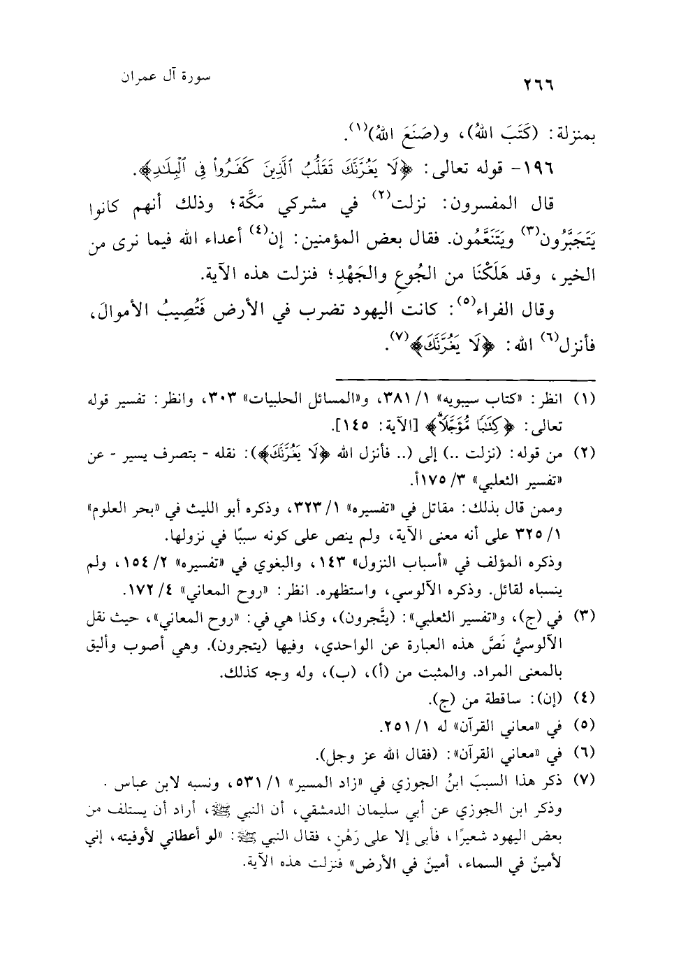 (¬1) قد يُفْهم قولُ الفراء هذا، من عباراته التي يقول فيها: (كانت اليهود تضرب في الأرض فتصيب الأموال، فقال الله عز وجل: لا يغرنك ذلك. وقوله: {مَتَعٌ قَلِيلٌ} في الدنيا). "معاني القرآن" 1/ 251. معنى قوله: (ذلك)، أي: ضَرْبُ اليهود في الأرض، متاع قليل.