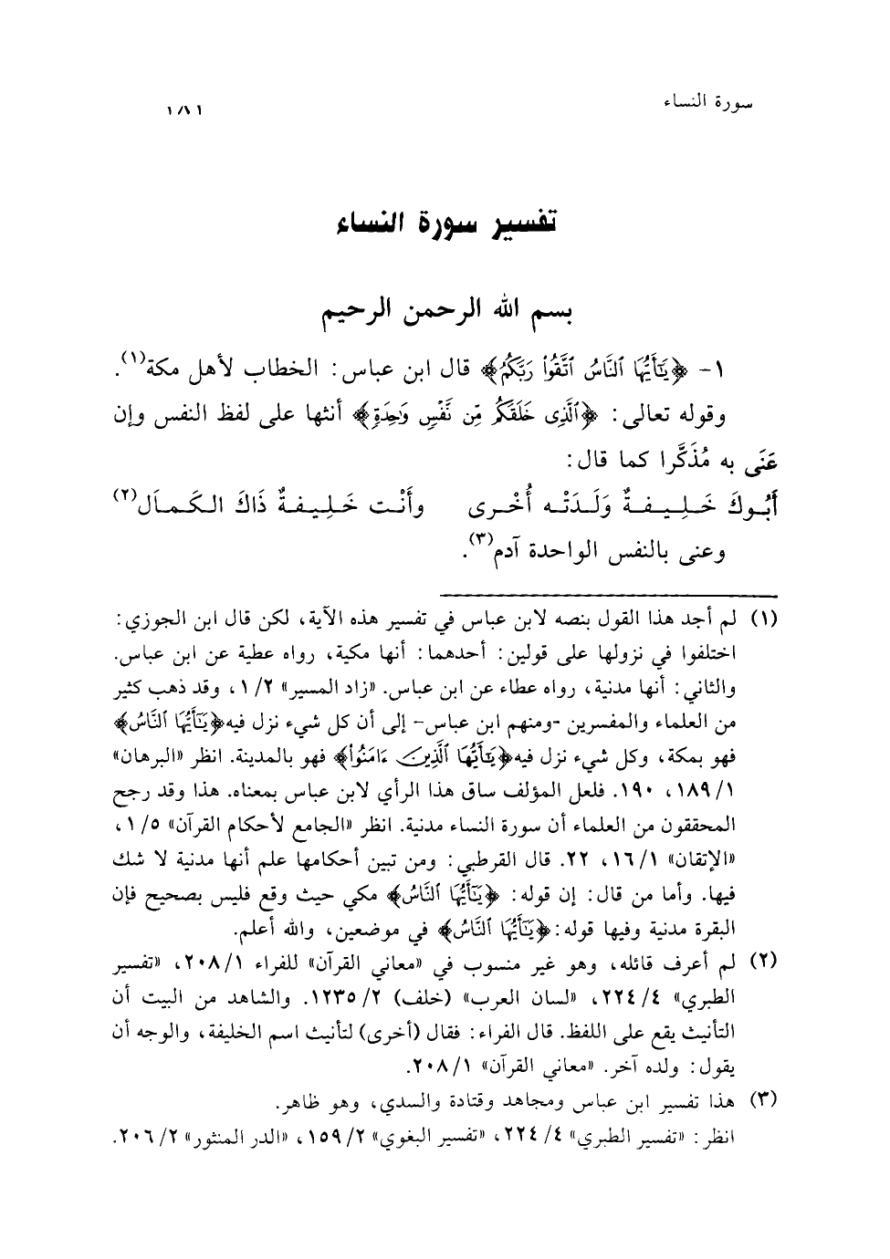 (¬3) انظر: "الحجة في القراءات السبعة" لابن خالويه ص 118، "حجة القراءات" ص 188، "الكشف عن وجوه القراءات السبع" لمكي 1/ 375.