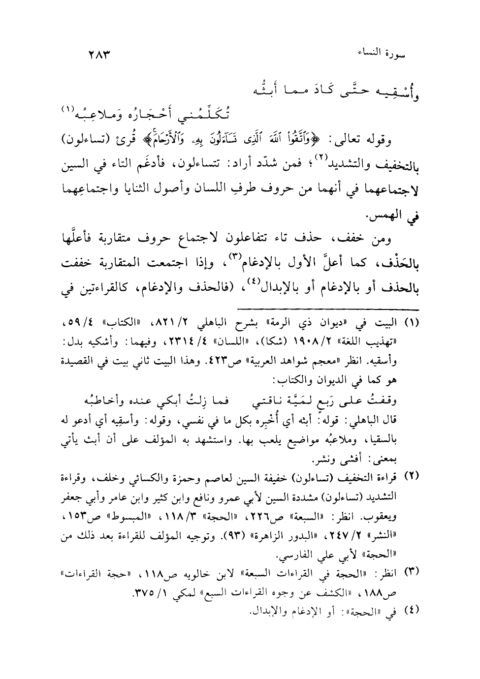 (¬4) ما نسبه المؤلف إلى أبي علي أحد الوجهين الذين ذكرهما في نصب الأرحام، والوجه الآخر أن يكون معطوفًا على قوله: {وَاتَّقُوا}، التقدير: {وَاتَّقُوا اللَّهَ الَّذِي تَسَاءَلُونَ بِهِ}، واتقوا الأرحام أي اتقوا حقَّ الأرحام فصلوها ولا تقطعوها. "الحجة" 3/ 121. وسيأتي نحوه عند المصنف قريبًا.