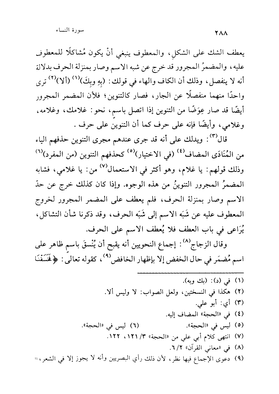 (¬2) في "الحجة" لم يستجيزوا العطف عليه في حال السعة إلا بالتأكيد.