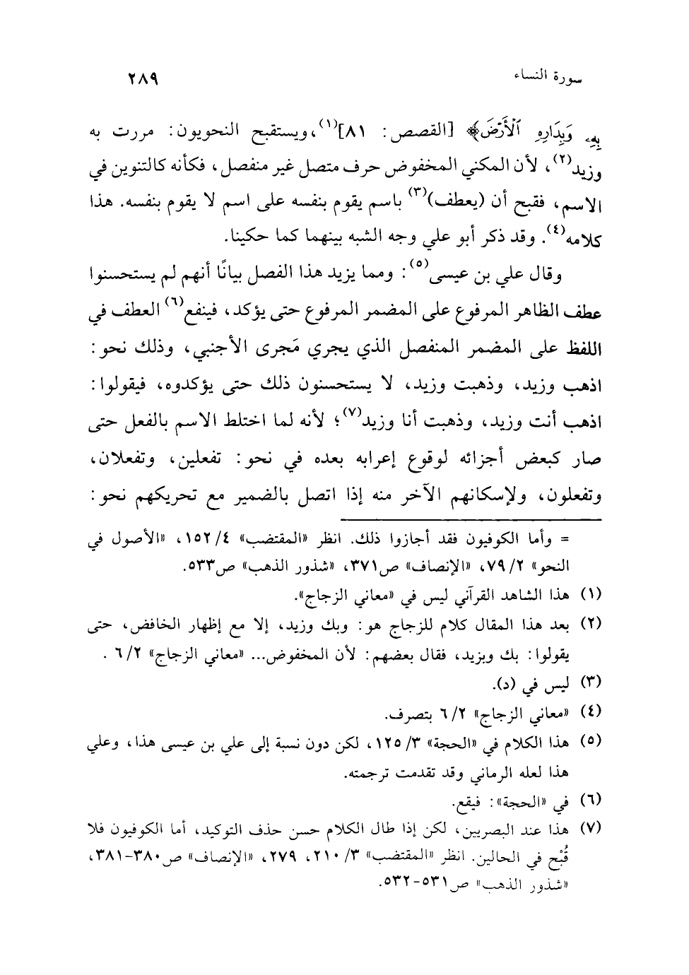 وقال سيبويه: لا يجوز عطف الظاهر على المكني المخفوض من غير إعادة الخافض إلا في ضرورة الشعر (¬3)، وأنشد: