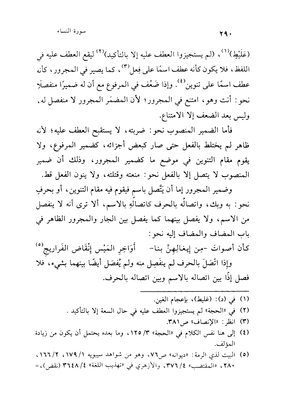 (¬1) "معاني القرآن" للفراء 1/ 253. والبيت نسبه الجاحظ في "الحيوان" 6/ 494 لمسكين الدارمي، وانظر "الإنصاف" ص 378، "معجم شواهد العربية" ص 237. واختلفت الروايات لأول البيت بين نُعَلِّق بالنون والبناء للمعلوم فيكون سيوفَنا منصوبًا على أنه مفعول به، وبين تُعَلَّق بالتاء والبناء للمفعول ويكون سيوفُنا مرفوعًا على أنه نائب فاعل. كما أن قافيته جاءت على روايتين: نفانف، وتنائف. قال عبد السلام هارون في شرحه للحيوان: مثل السواري، عنى بها أعناق الرجال. والسارية: الأسطوانة من أساطين البيوت ونحوها. التنائف جمع تنوفة وهي المفازة، وهذه مبالغة ظاهرة أن يجعل ما بين أعناقهم وكعوبهم تنائف. والشاهد منه أنه عطف الكعب على الضمير في بينها دون إعادة الخافض.