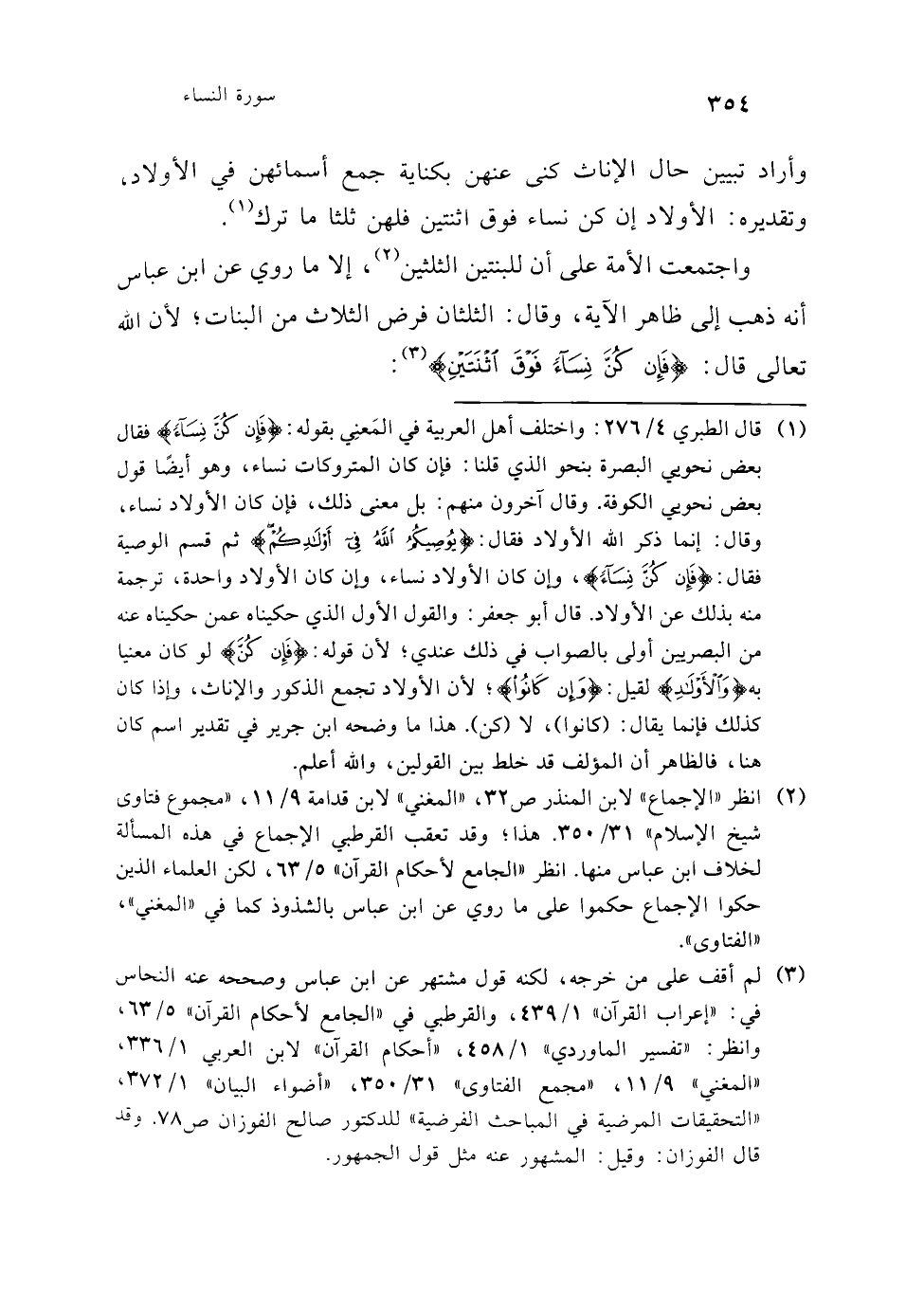 وحرر الحسن بن يحيى (2) هذا الفصل فقال: (إن الله تعالى) (3) أمسك في هذه الآية عن ذكر البنتين، وذكر الواحدة والثلاث وما فوقها، وذكر فيِ (قوله (3)): {يَسْتَفْتُونَكَ} في آخر النساء الأخت الواحدة والبنتين (4) , وأمسك عن ذكر الثلاث وما فوقها، فتضمن كل واحدة من هاتين الآيتين ما كف عن ذكره في غيرها, ويحتمل كل واحد منهما فيما أمسك عنه فيها على ما ذكره في غيرها ليأتلف المعنى على (ما يجب (5)) إن شاء الله (6).