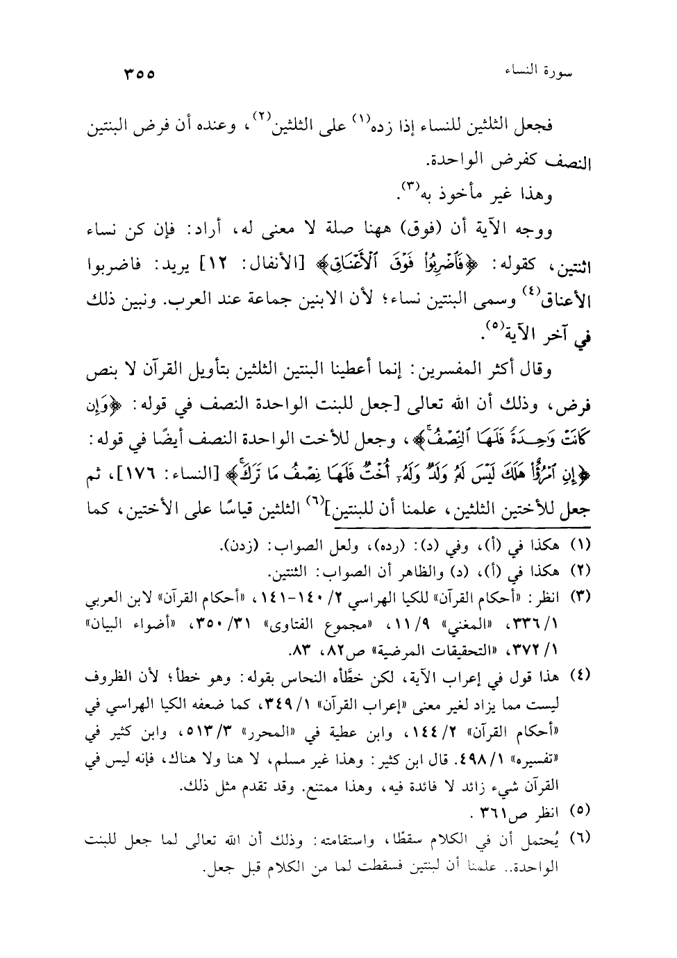 وأما مذهب ابن عباس فهو محال في القياس، حيث يجعل البنتين كالواحدة. والبنتان كالجماعة؛ لأن منزلة الاثنين منزلة الجمع (¬1)، في كثير من الأحكام، فصلاة الاثنين جماعة، والأخوان كالإخوة في حجب الأم من الثلث إلى السدس، ويجيء ذلك في آخر الآية، فالجمع بالجمع أولى أن يقاس من الجمع بالواحد (¬2). وأيضًا فإن الآية في قول مقاتل، والكلبي نازلة في أم كجّة (¬3)، وكانت لها ثلاث بنات، فنزلت في جواب ما استفتت وأجيبت في بناتها خصوصًا، وكن ثلاثًا (¬4)، ولذلك ما خصت الثلاث بالذكر في الآية دون الثنتين.