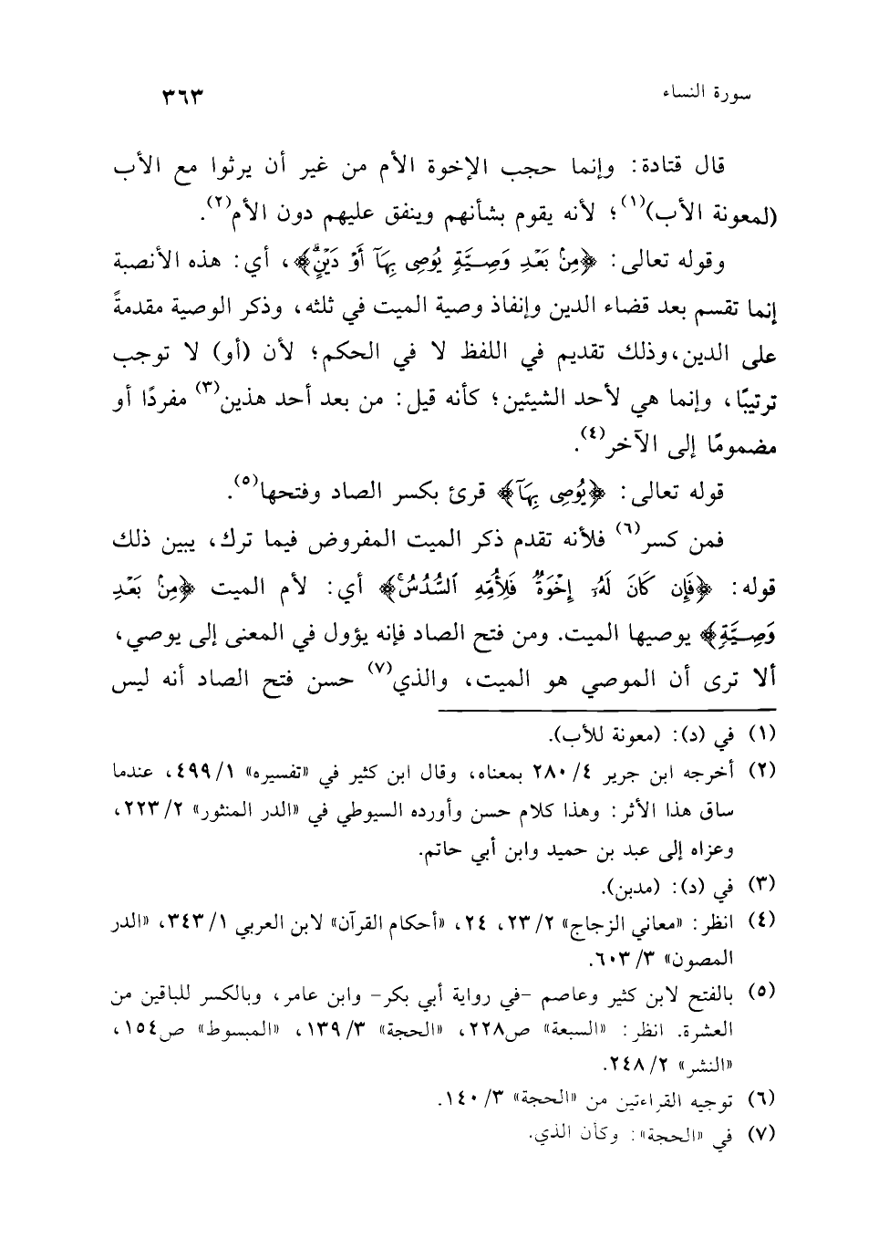 (¬5) انظر: "تفسير الطبري" 4/ 281 - 282، "إيضاح الوقف والابتداء" 2/ 593، "الدر المنثور" 2/ 223, 224.