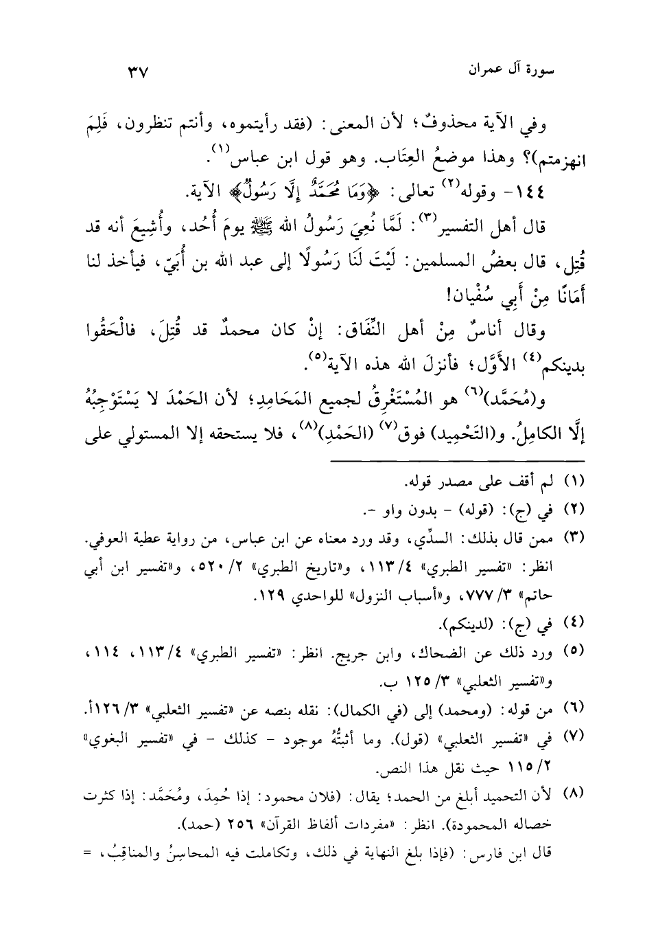وقوله تعالى: {وَمَا مُحَمَّدٌ إِلَّا رَسُولٌ}، يريد: المُرْسَل. يُقَوِّي ذلك قوله: {إِنَّكَ لَمِنَ الْمُرْسَلِينَ} [يس: 3]. ومثل (¬2) هذا في (فعُول)، يراد به (المفعول): (الرَّكُوب)، و (الحَلُوُب): لِمَا يُحْلَبُ، ويُرْكَبُ (¬3).