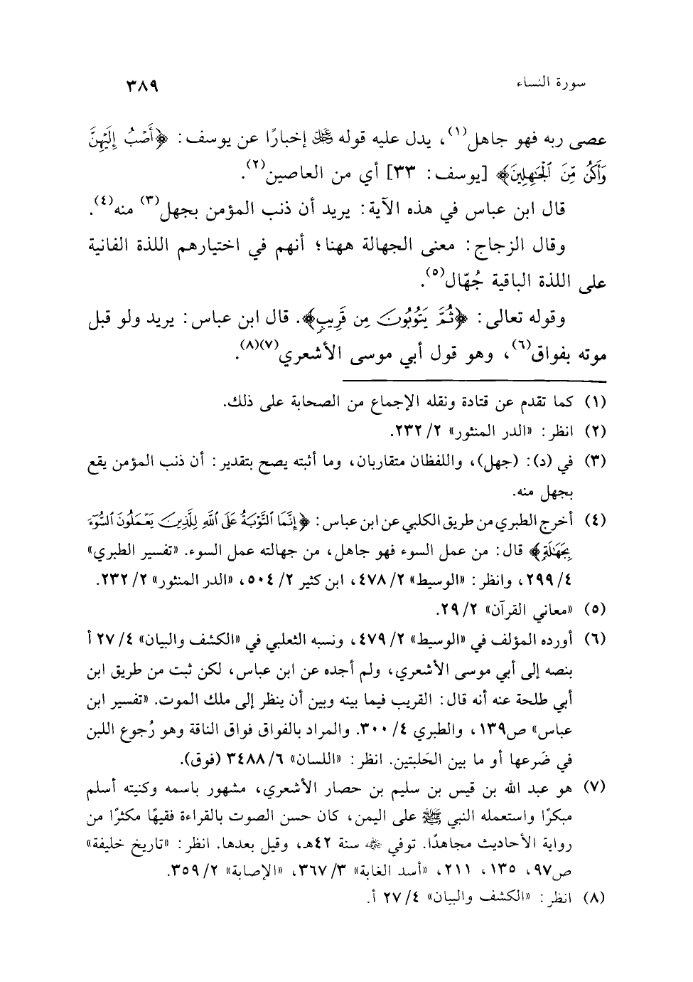 (¬5) أخرج الطبري بإسناده عن الربيع: {إِنَّمَا التَّوْبَةُ عَلَى اللَّهِ لِلَّذِينَ يَعْمَلُونَ السُّوءَ بِجَهَالَةٍ ثُمَّ يَتُوبُونَ مِنْ قَرِيبٍ}، قال: نزلت الأولى في المؤمنين، ونزلت الوسطى في المنافقين، يعني: {وَلَيْسَتِ التَّوْبَةُ لِلَّذِينَ يَعْمَلُونَ السَّيِّئَاتِ}، والأخرى في الكفار، يعني: {وَلَا الَّذِينَ يَمُوتُونَ وَهُمْ كُفَّارٌ}. "تفسير الطبري" 4/ 303.