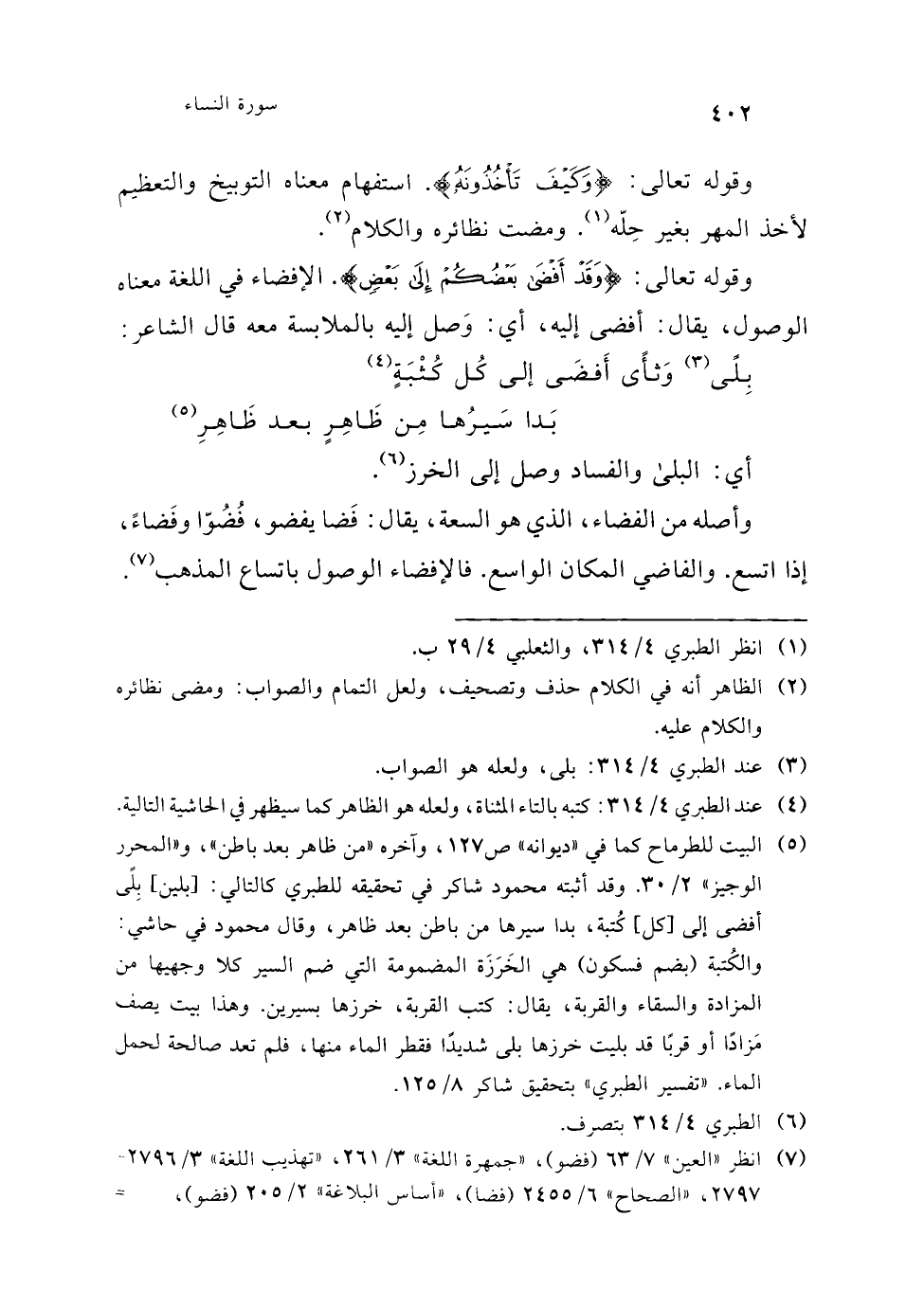 واللغة تحتمل المذهبين، روى ثعلب، عن ابن الأعرابي: أفضى الرجل: دخل على أهله، وأفضى: إذا جامعها (¬4). قال (¬5): والإفضاء في الحقيقة الانتهاء، ومنه قوله تعالى: {وَكَيْفَ تَأْخُذُونَهُ وَقَدْ أَفْضَى} أي: انتهى وأوى (¬6).