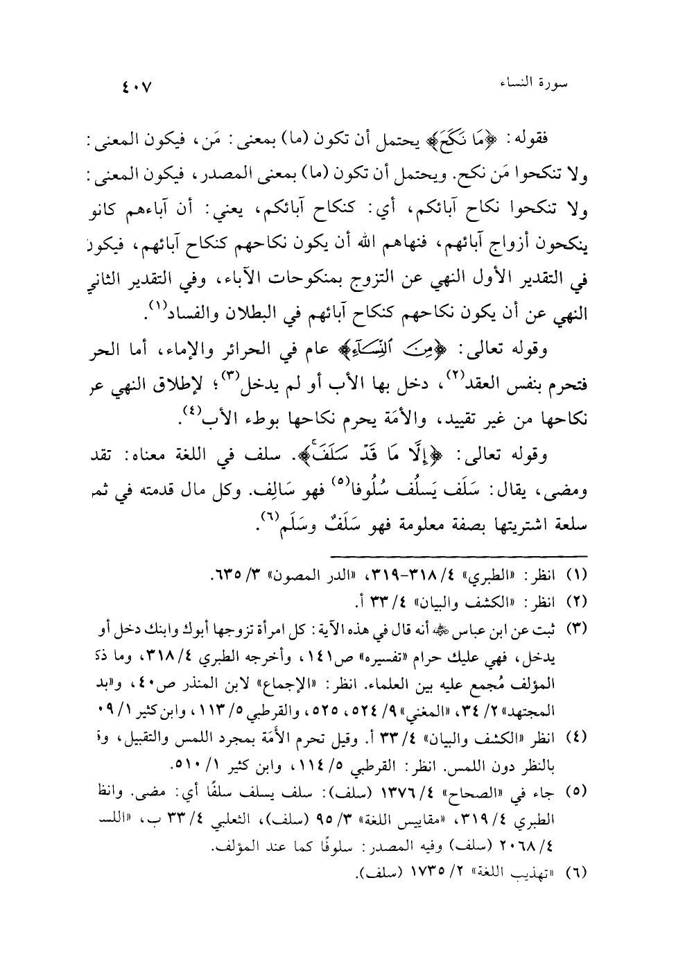 (¬8) عبارة الأخفش في "معاني القرآن" 1/ 440: وقال: {وَلَا تَنْكِحُوا مَا نَكَحَ آبَاؤُكُمْ مِنَ النِّسَاءِ إِلَّا مَا قَدْ سَلَفَ}؛ لأن معناه: فإنكم تؤخذون به، فلذلك قال: {إِلَّا مَا قَدْ سَلَفَ}، أي: فليس عليكم جناح، فكأن في كلامه سقطًا، أو أن المؤلف تصرف في العبارة.