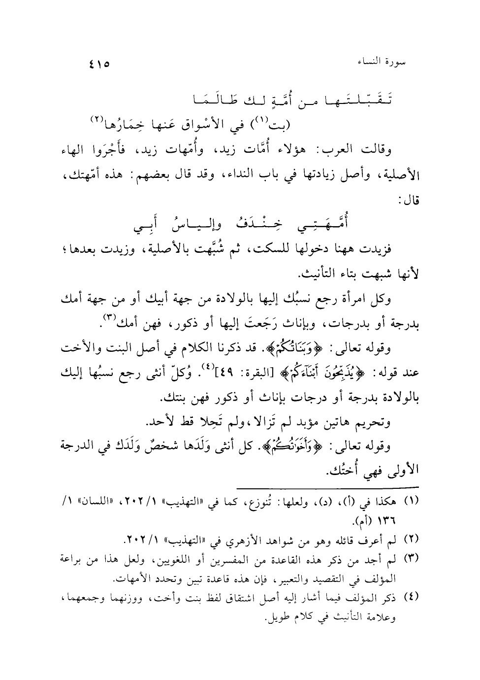 = رضعات وغيره انظر: "المغني" 310، 311، "مجموع فتاوى شيخ الإسلام" 34/ 33، 34، "تفسير ابن كثير" 511 - 512.