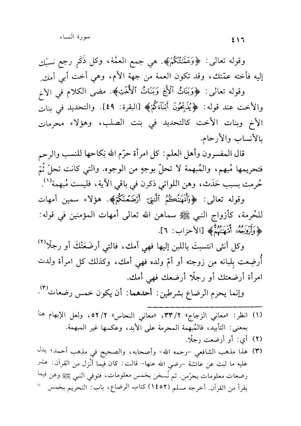 وقوله تعالى: {وَأُمَّهَاتُ نِسَائِكُمْ}. حد أم امرأتك كحد أمك، سواءٌ كانت من اللبن أو من النسب، فهي حرام عليك بنفس العقد على ابنتها؛ لأن الله تعالى أطلقَ التحريم ولم يُقيِّده بالدخول. هذا إجماع الأمة اليوم (¬2).