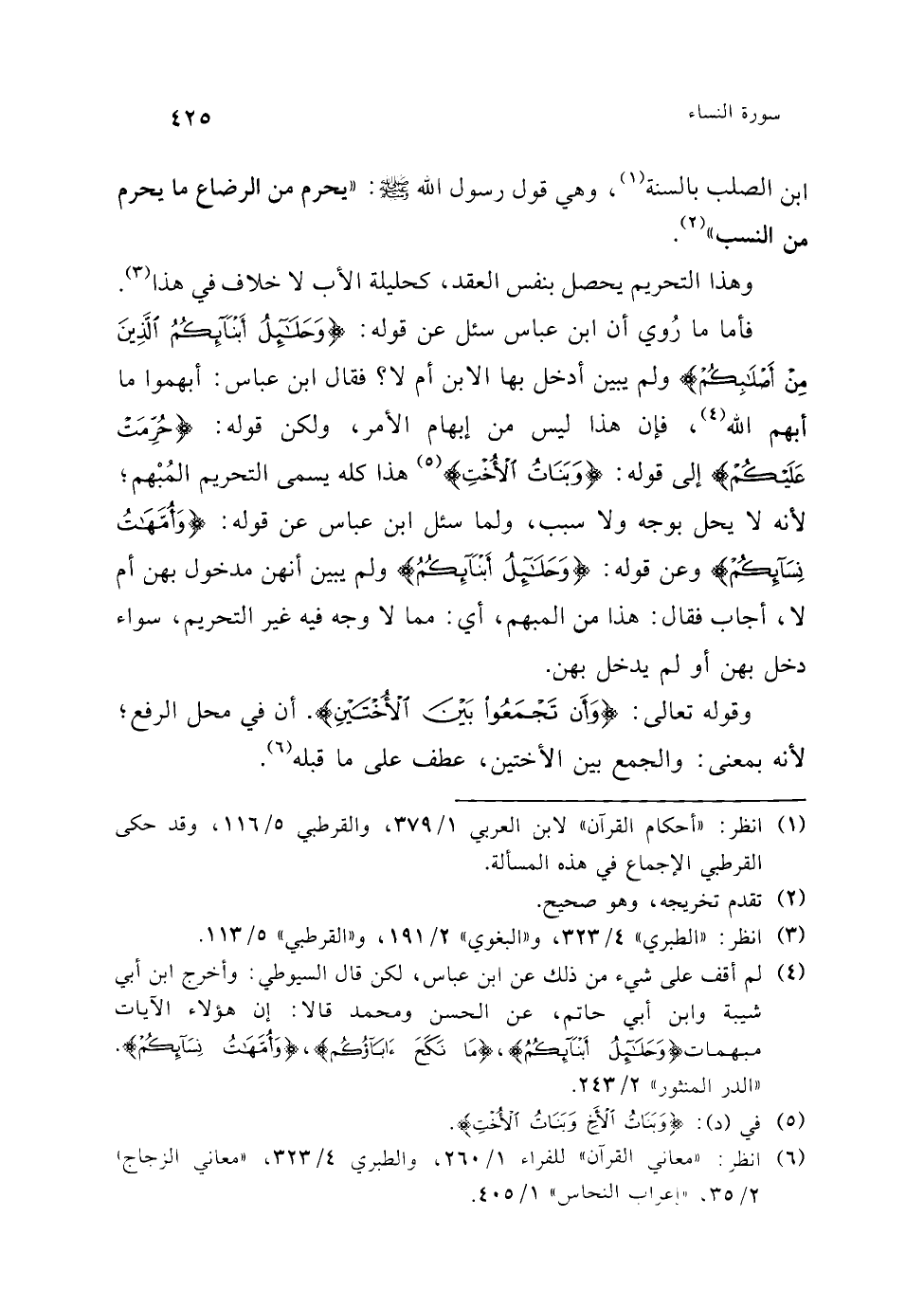 واعلم أن المحرمات بالنسب سبعة أصناف، ذُكِرت نسقًا في أول الآية. والمحرمات بالسبب صنفان: صنف يحرم بالرضاع، وهو الأمهات والأخوات، على ما ذكرنا من التفصيل، وصنف يحرم بسبب المصاهرة، وهو أم المرأة وحليلة الأب وحليلة الابن والربائب، على التفصيل الذي ذكرنا، وحليلة الأب لم تُذكر في هذه الآية، إنما ذكرت في قوله: {وَلَا تَنْكِحُوا مَا نَكَحَ آبَاؤُكُمْ} [النساء: 22].