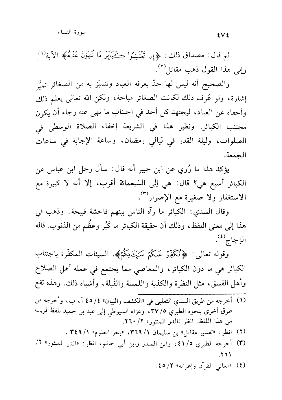 (¬3) أخرجه عبد الرزاق في "تفسيره" 1/ 156، والترمذي (3022) كتاب تفسير القرآن، باب: 5 من سورة النساء، وقال: هذا حديث مرسل، والطبري 5/ 46 - 47, والحاكم في "المستدرك" 2/ 305، والمؤلف في "أسباب النزول" ص 154.