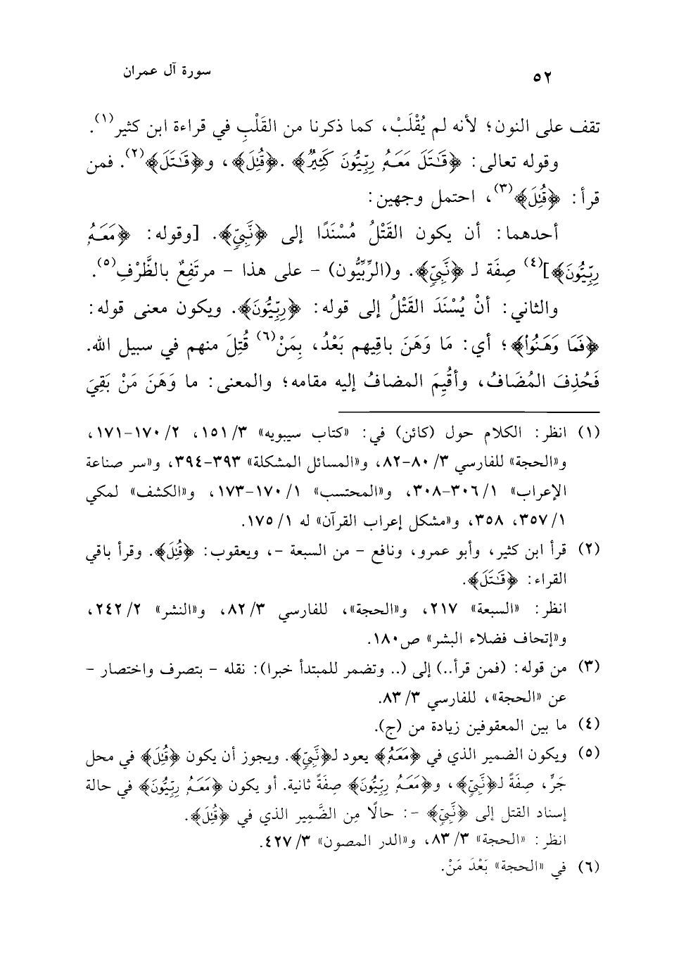 (¬3) قوله في "تفسير الطبري"4/ 119ونصه عنده: (جموع كثيرة، قتل نبيهم). وفي "تفسير الثعلبي" 3/ 129 ب، ونصه عند: (الرِّبِّيَّة الواحدة: ألف)، وكذا في: "تفسير البغوي" 2/ 116.