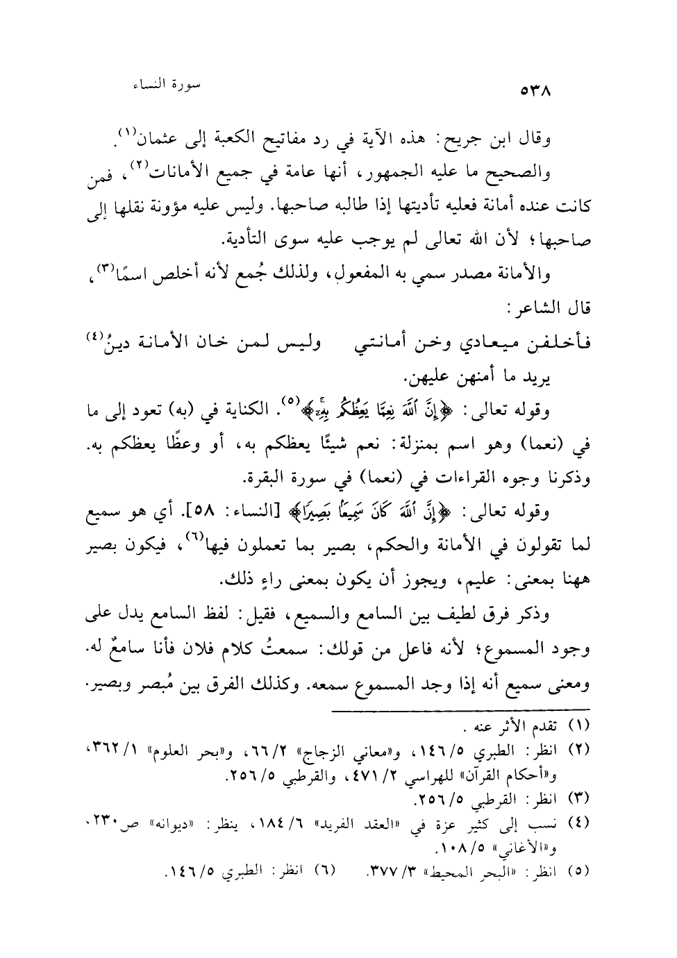 وقال ابن زيد: هم الأمراء والسلاطين، أمروا بأداء الأمانة بقوله: بحسن الطاعة لهم (¬5).