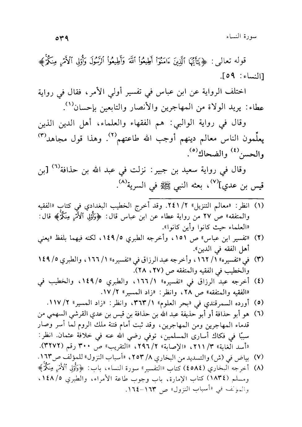 (¬3) هكذا جاءت هذِه العبارة في (ش) ولعل في الكلام سقطا بعد كلمة السلطان، كما هو ظاهر. والصواب: طاعة السلطان [واجبة بالمعروف، فإن خرج أمره] عن الكتاب والسنة .. وانظر: نحو هذا الكلام في الطبري 5/ 150، "بحر العلوم" 1/ 363، "النكت والعيون" 1/ 500، "الدر المنثور" 2/ 316 - 317.