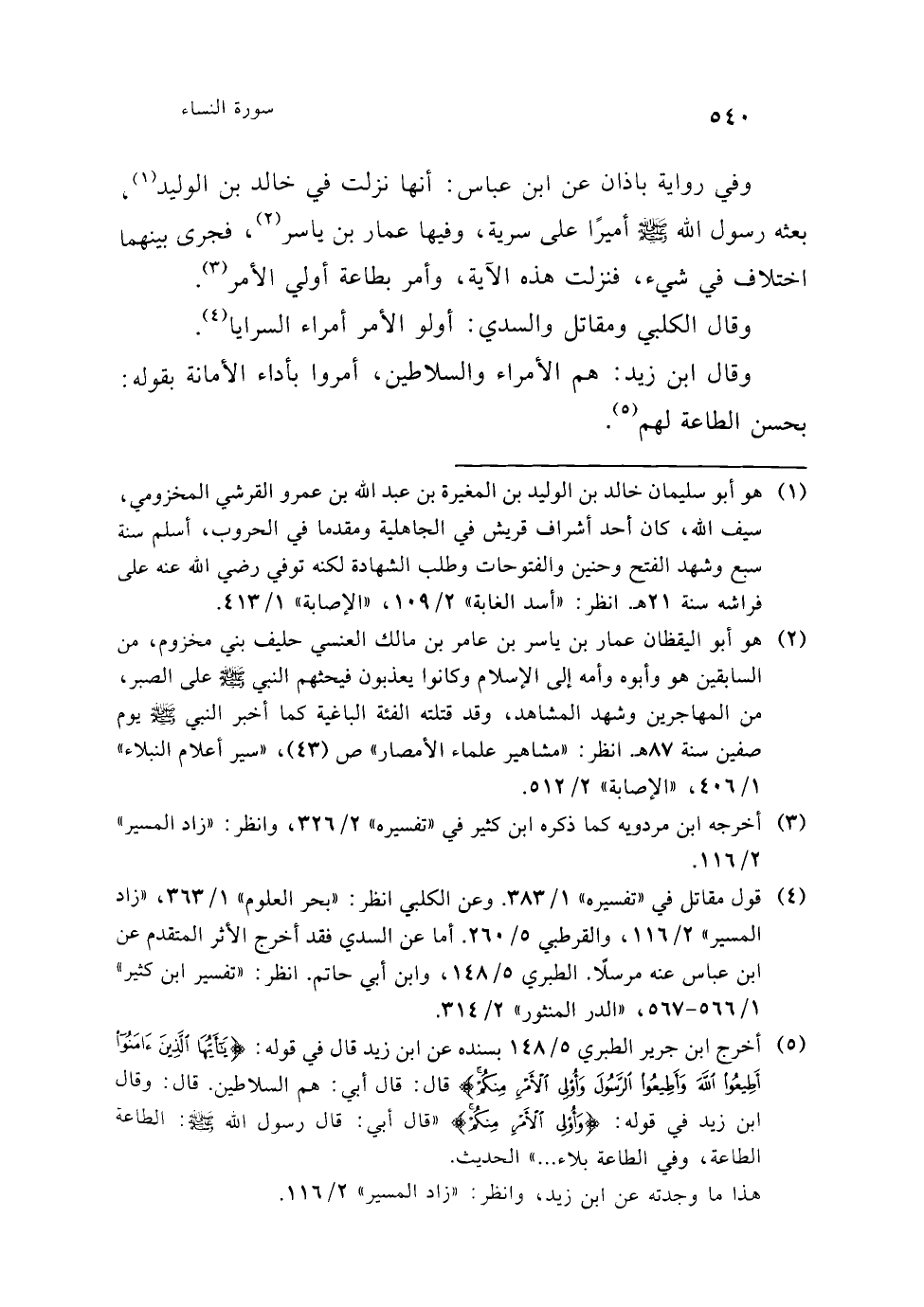 وأولو الأمر معناه: ذوو الأمر، وواحده (ذو) على غير قياس كالنساء والإبل والخيل، اسم للجمع لا واحد له من لفظه (¬4).