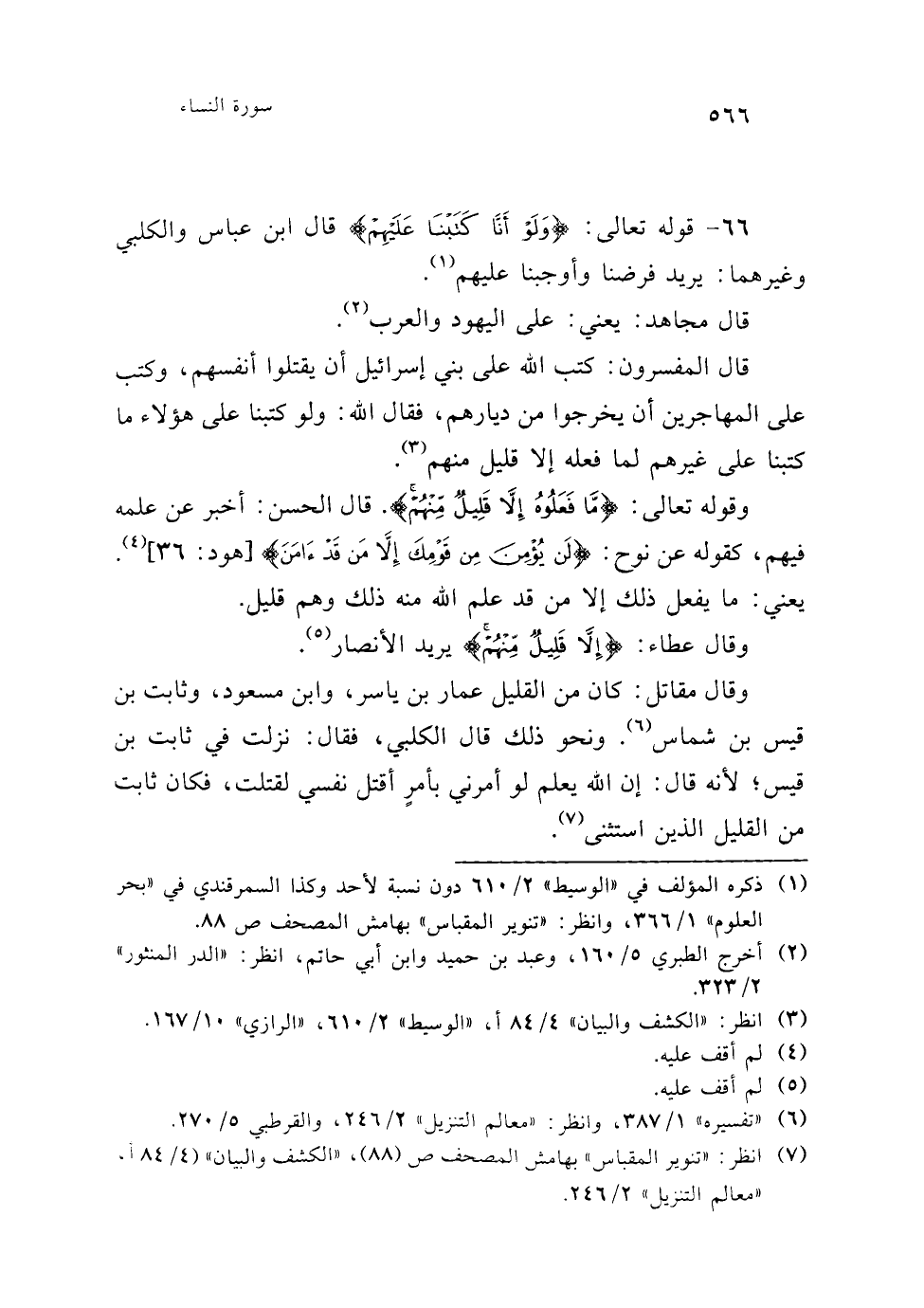 ولهذا المعنى الذي ذكرنا أن القليل غير مستثنى من المنافقين اختار جماعة من القراء (....) (¬2) الوقف على قوله: {مَا فَعَلُوهُ} إشعارًا أن هذا الاستثناء منقطع من الأول (¬3).